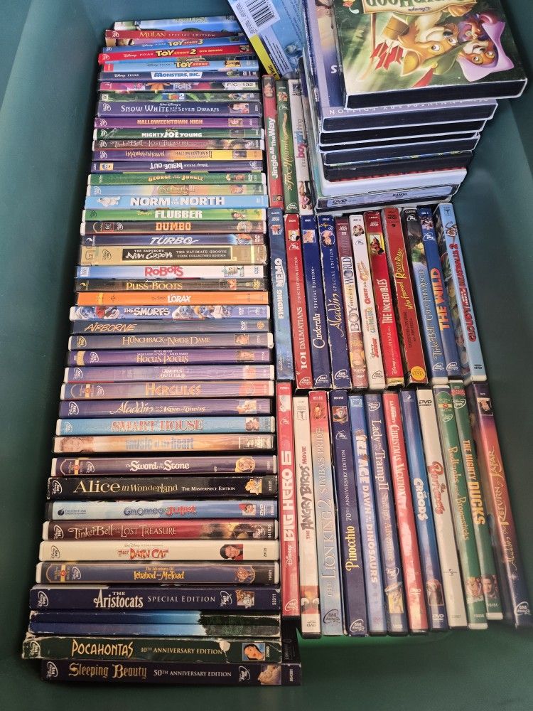 Tote of 90 Dvds that are mainly Disney and Pixar sold all together pickup only cash only