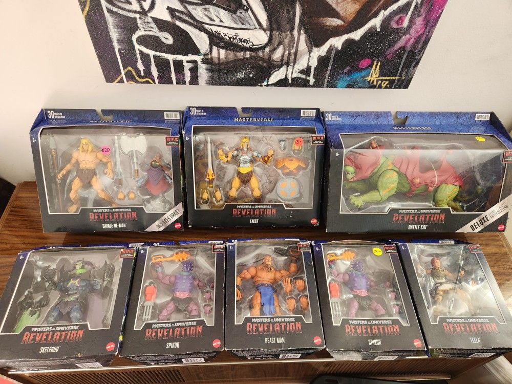 Battle Cat, Faker, Savage He-Man, Teela, Beast Man, Skelegod, 2× Spikor. 2021 Mattel