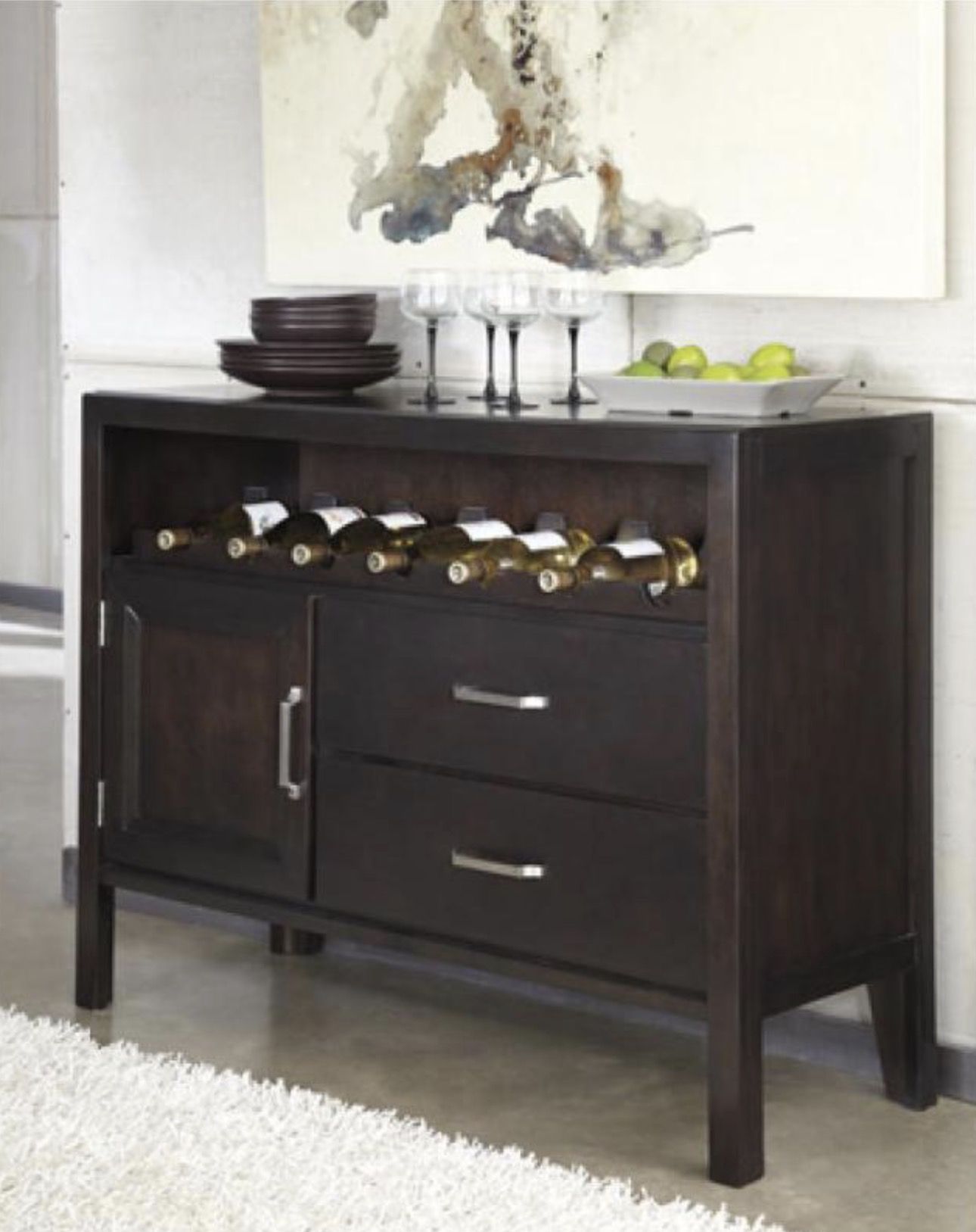 Metro modern style Wine holder for 7 bottles Set includes: One (1) server Materials: Glass, ash veneer, Asian hardwood, Kenlin center guides Finish: Dark brown Weight: 141 pounds Dimensions: 35.63 inches high x 47.25 inches wide x 17.5 inches deep Minor signs of use but in good condition