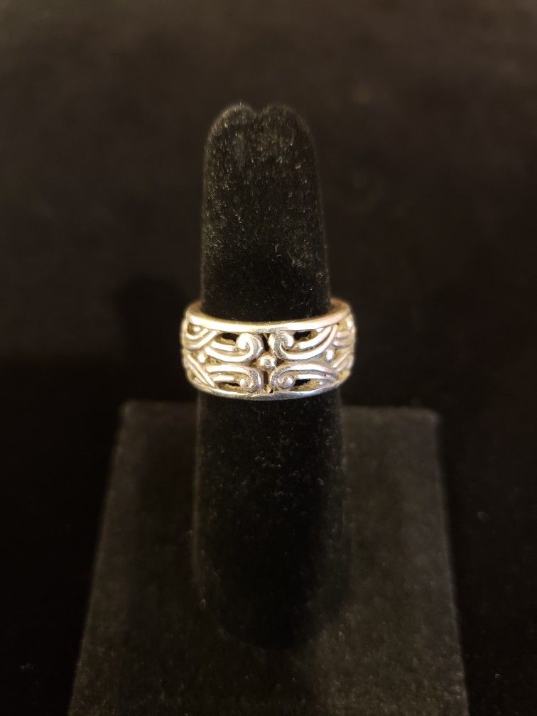 This is a simple yet intricate Band ring with lovely cut out scrolled detail all around ring. I cannot see any markings inside of band for Sterling but it is heavy for size and passes magnet test for Silver and has nice Silver patina. Local Burien vicinity pickup or can ship Please check out my other listings for unique finds! ๐ฟ ๐ฟ ๐ฟ