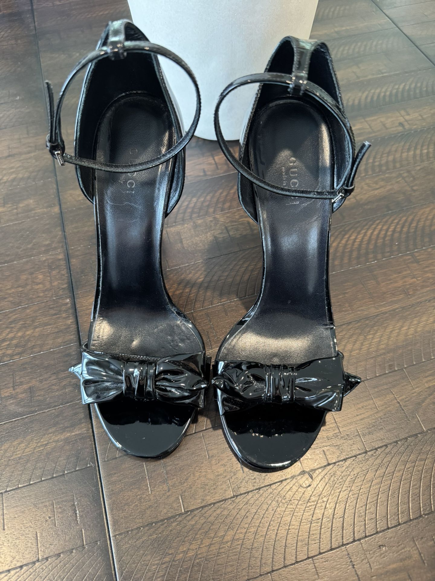 Black patent leather women’s Gucci sandals. Size 40, fits like a us size 9. 4.5 inch heel height. Worn once, light scuffing on bottom of shoes. Otherwise like new condition.