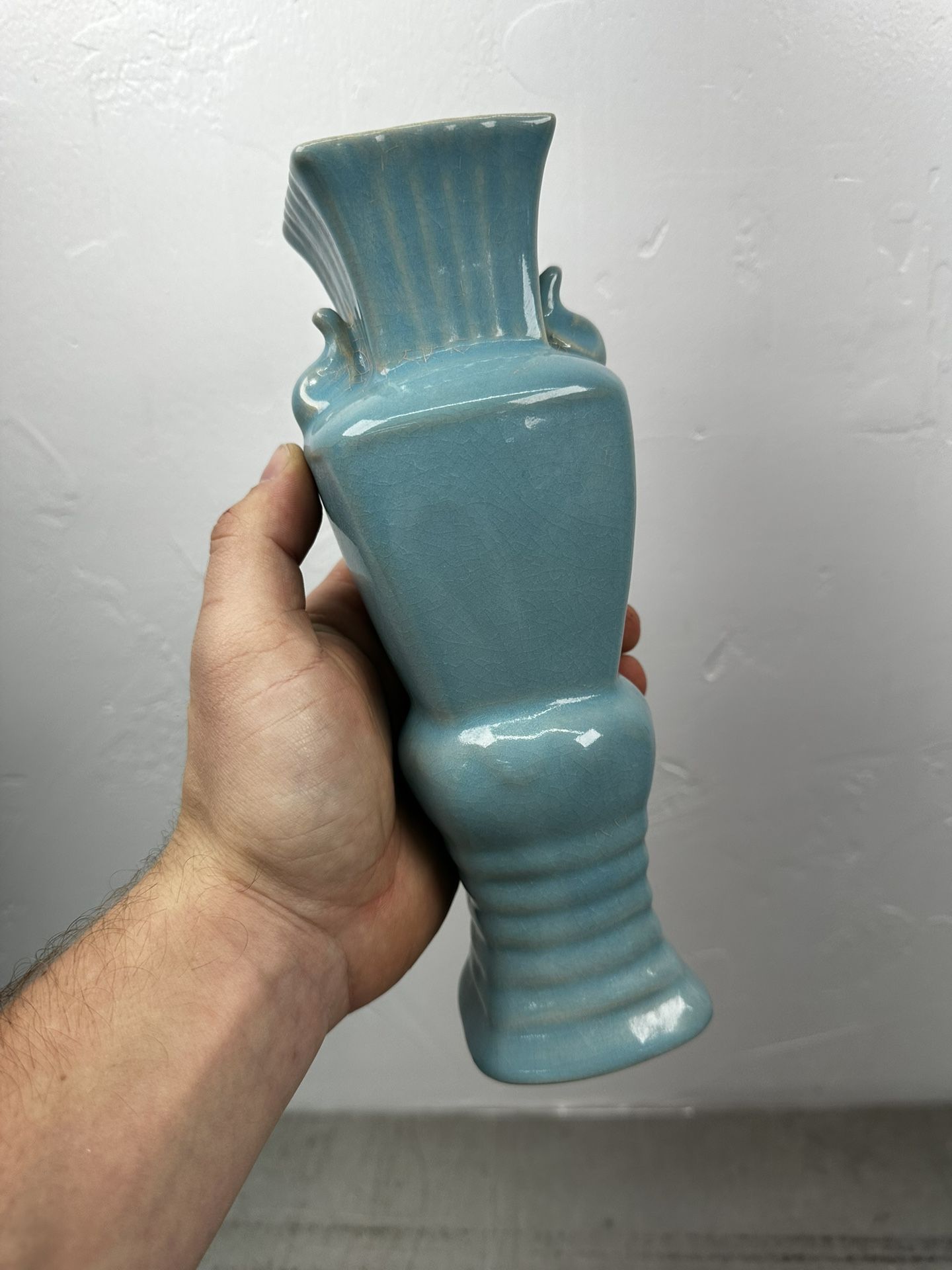 Chinese Porcelain Song Style Ru Kiln Sky Blue Crackle Glaze Square Eared Vase