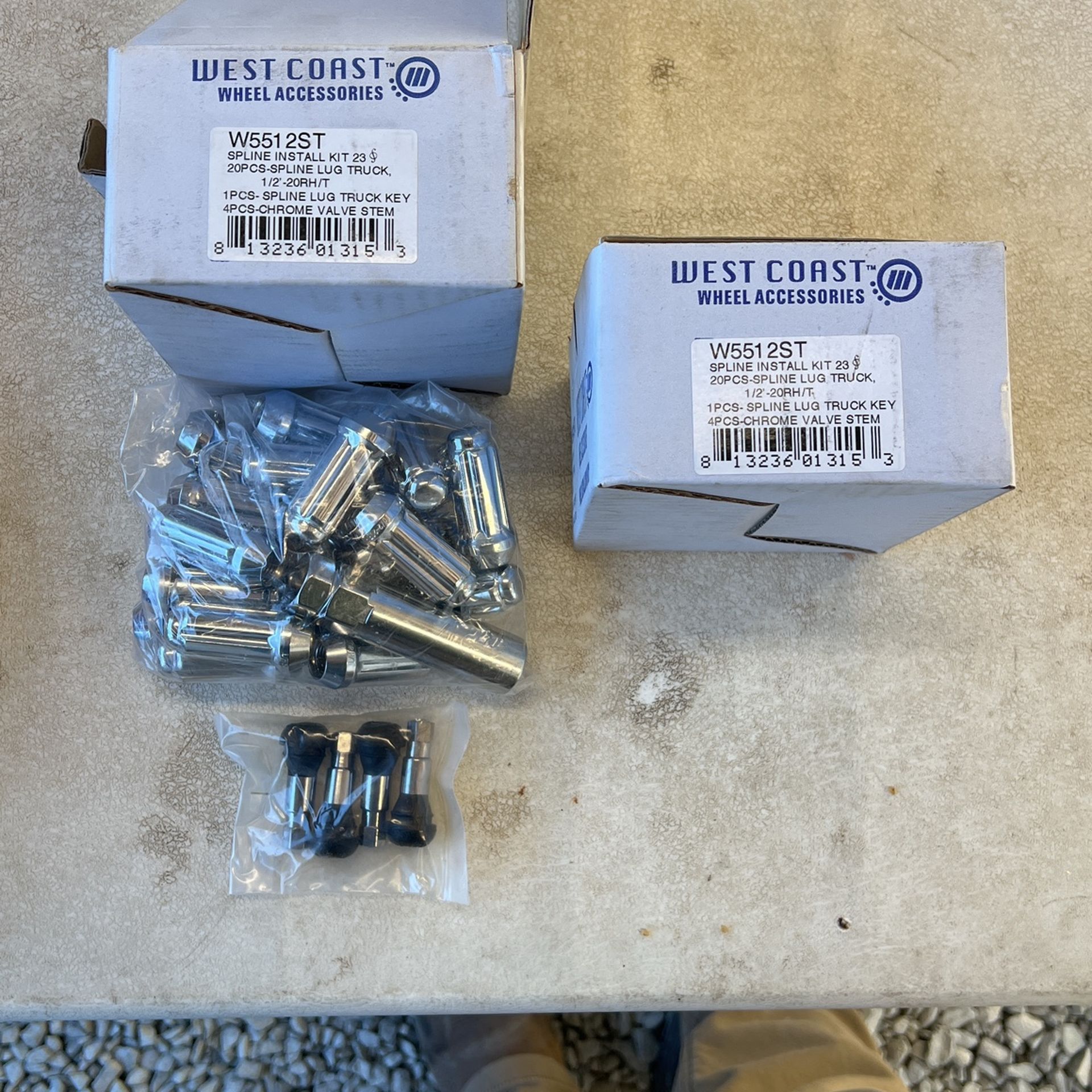 TWO BOXES, both for $70, one for $35 Brand new never installed Each box contains: (20) splined lugs 1/2-20 RH/T (1) spline key (4) chrome valve stems
