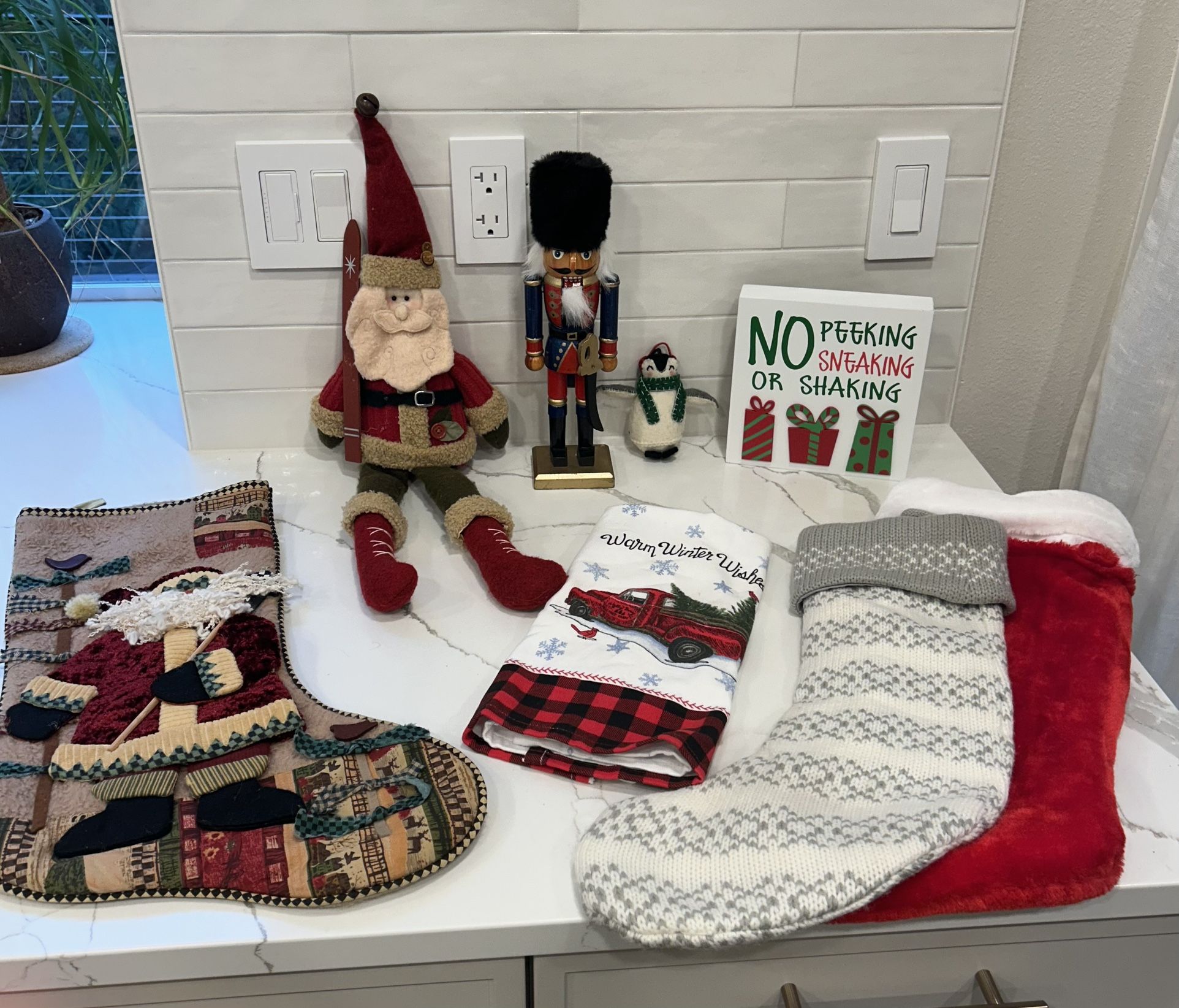 Free holiday decor items. 3 stockings, dish towel, nutcracker, stuffed santa, penguin ornament, and small sign. Porch pickup.