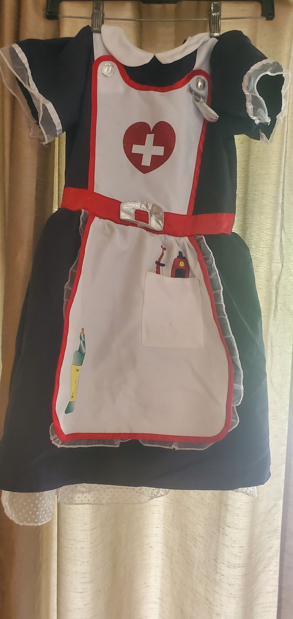Halloween or dress-up. Old fashioned "nurse" dress. No size tag but looks to fit are 5t or 6. Slit at both armpit seems due to tightness.
