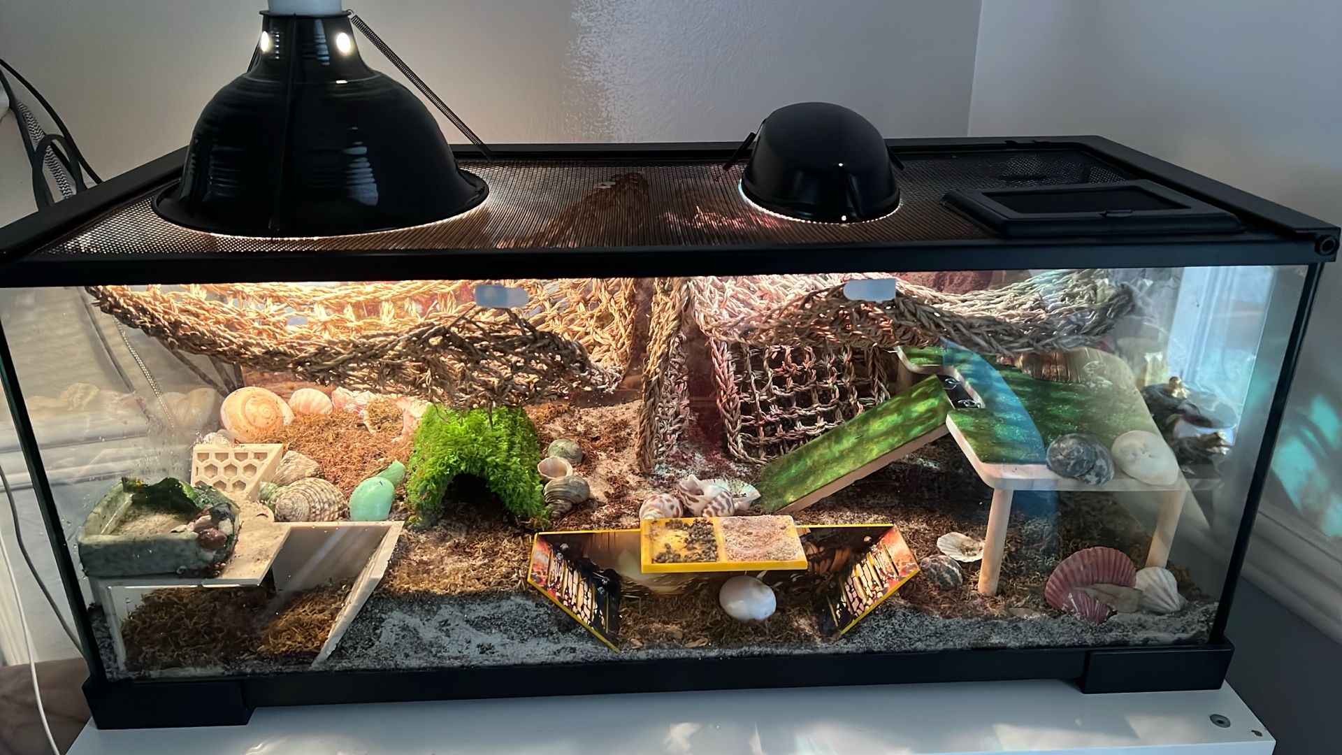 Everything pictured: 30 Gl tank, metal netted slide in lid with an extra small door, Three levels of climbing and digging fun, 3d printed tunnels for viewing, Wooden and fake grass mezzanine, Hemp netting to climb around the top and soak up the heat lamps, Two heat lamps and a sticky heat pad, Lots of extra shells for crabs and decoration, Back drop picture of dessert, new sand/coconut fiber/moss, Foods/supplements/water bottles, Small salt water pool, fresh water dispenser, Mopani wood , Not pictured: cholla wood, two bags of hermit sand, coconut hideout, two extra mini halogen bulbs for the small lamp, small and large sized cattapa leaves, Extra live moss (in freezer bag) Must pickup in Graham Price greatly discounted from new cost- (will not sell things separately at this point). Make reasonable offer. Thanks for looking.