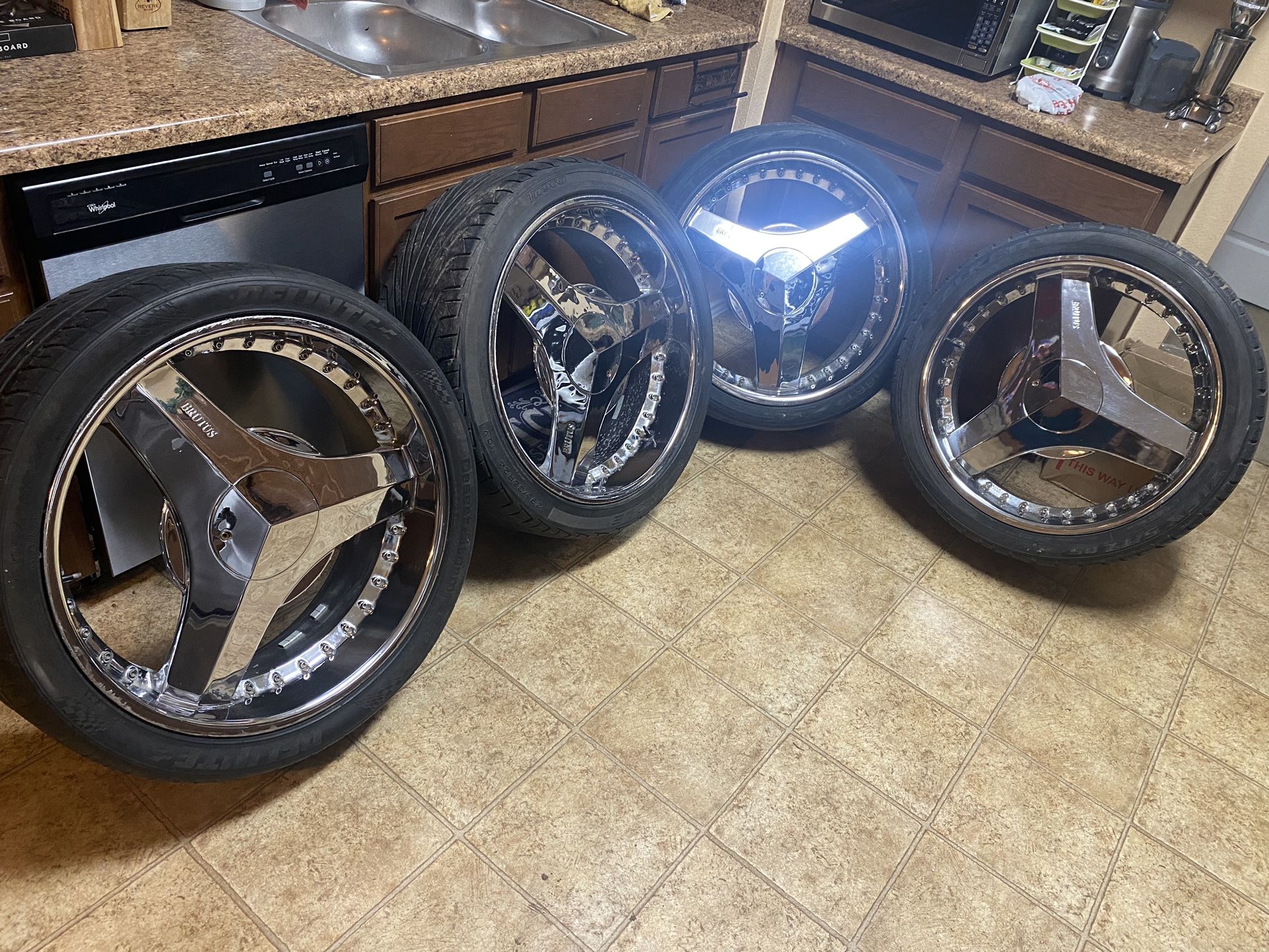 Set of 24” brutus blades all rims are good and have all caps will need 2 tires other 2 are good the lug pattern is 6 lug for GM I’m takeing $1500 firm Elbows 84s 83s TWW SLAB vogues Swanga Prongs Rims Chrome Swang Swangaz {contact info removed}s 20s 17s 15s Wire Wheels Whips Ride Candy Paint Slab Donk Donks Bubble Screens Headrest Leather WoodWheel HIDs Pop Trunk Neon JL Audio Car Audio Kicker Speakers Bass 5th Wheel 6th Wheel Leather sun roof Custom Box Ported Box Caprice Classic Paint Pro Box chevy buick Cadillac koo