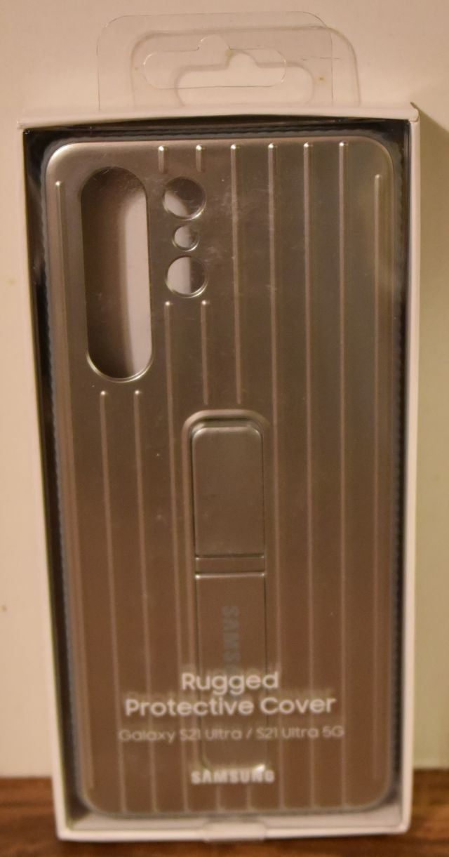 New, still in original package. Outstanding protection. Help defend your new Galaxy S21 Ultra 5G against damage caused by drops and falls. The Rugged Protective Cover has been drop-tested to provide outstanding protection. Watch in comfort. The back of the case houses two kickstands to hold your phone up in landscape mode at two optimal viewing angles: 60 degrees or 45 degrees. While watching videos or looking at pictures, it's been carefully designed to give you a full, cinematic view. Will sell for $20.00