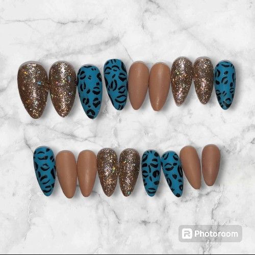 Medium almond shape press on nails can be wore for any event, leopard print with a touch of gold glitter handmade set of 18 comes with everything to prep and apply nails