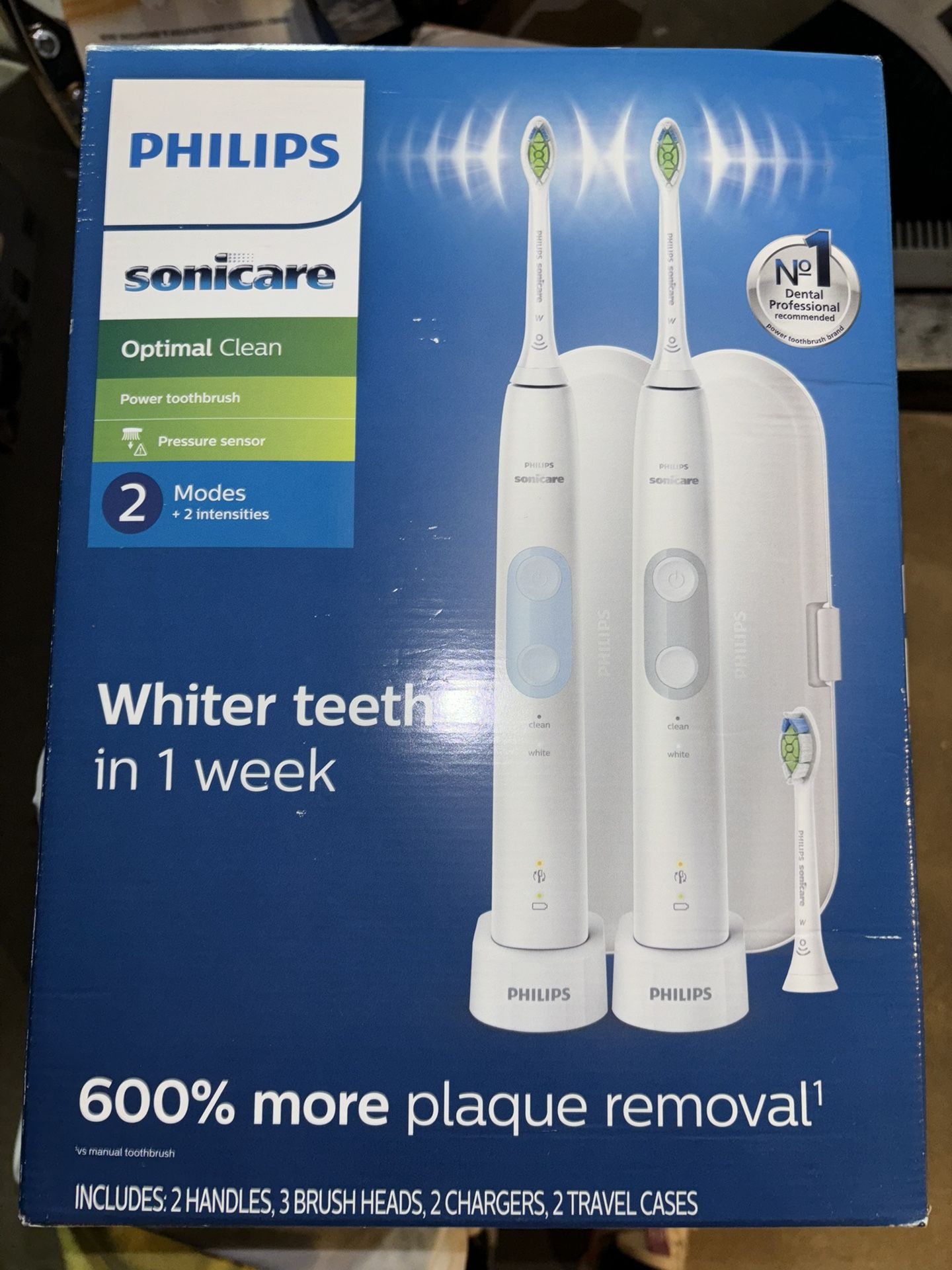 Sonicare Optimal Clean - 2 Pack Rechargeable electric toothbrush. 2 modes: clean & white 2 rechargeable handles 2 intensity settings Pressure sensor Replace head indicator 2 minute smart timer