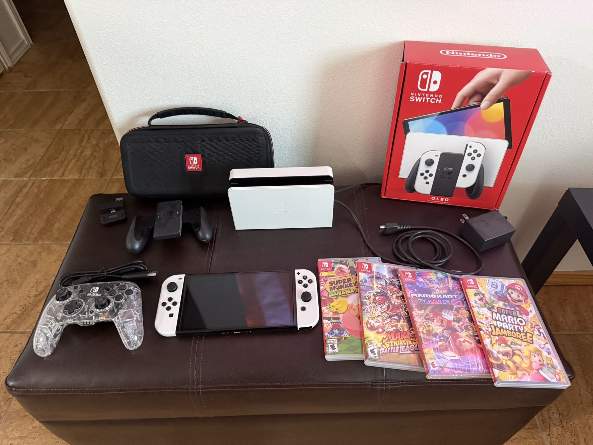 Adult owned! Everything included OLED Nintendo Switch in White ALL original accessories Four Games: Super Mario Party Jamboree (New-Sealed) Mario Kart Deluxe 8 Mario Strikers Battle League Super Monkey Ball Banana Mania Docking Station Bluetooth Adapter Extra LED Controller Nintendo Carrying Case HDMI Cable Portable TV Connecter