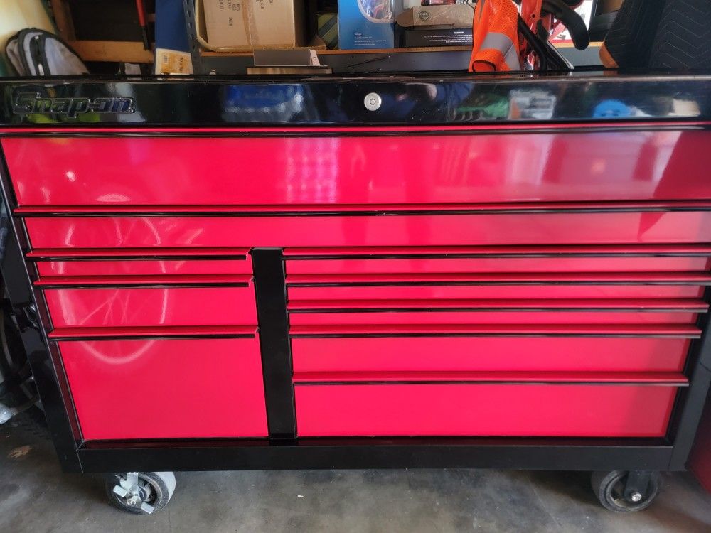 55 inch, 10 drawer, Double-Bank Classic Series Roller cabinet. High gloss black and red. Ball bearing slides, drawers rated for 120 pounds each.