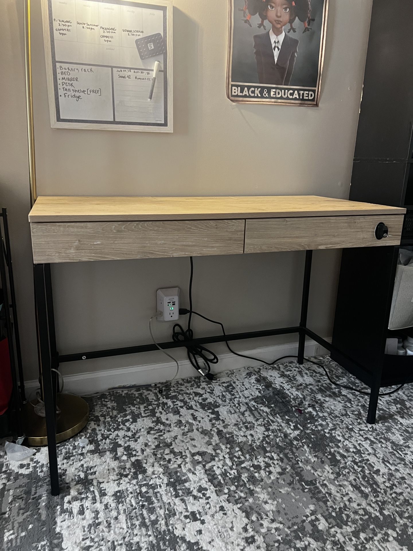 Modern desk with a wood-look top and black metal frame. Includes 2 drawers, with one locking drawer for secure storage. Desk is sturdy and functional with a clean, minimalist style. There are minor surface scratches from normal use (cosmetic only), but nothing that affects function. Details: 2 drawers (1 locking) Smooth wood-style finish Strong metal legs Great for home office, bedroom, or student setup Price: $30 Pickup only Message me if interested!