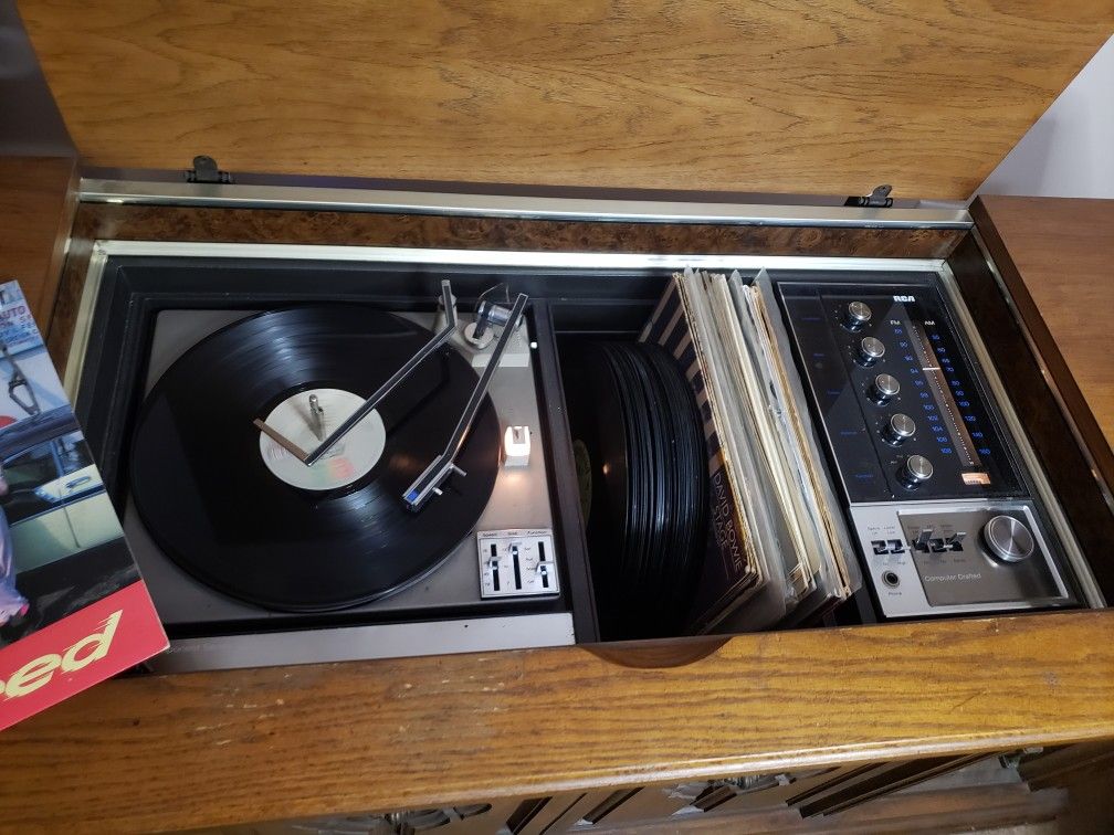 RCA console. Bought from an engineer who had it since new. Plays records and am/fm radio. Multiple speed and sizes. Low and high volume speaker controls. Speakers built in. 5ft wide 2 ft depth 2.4ft height