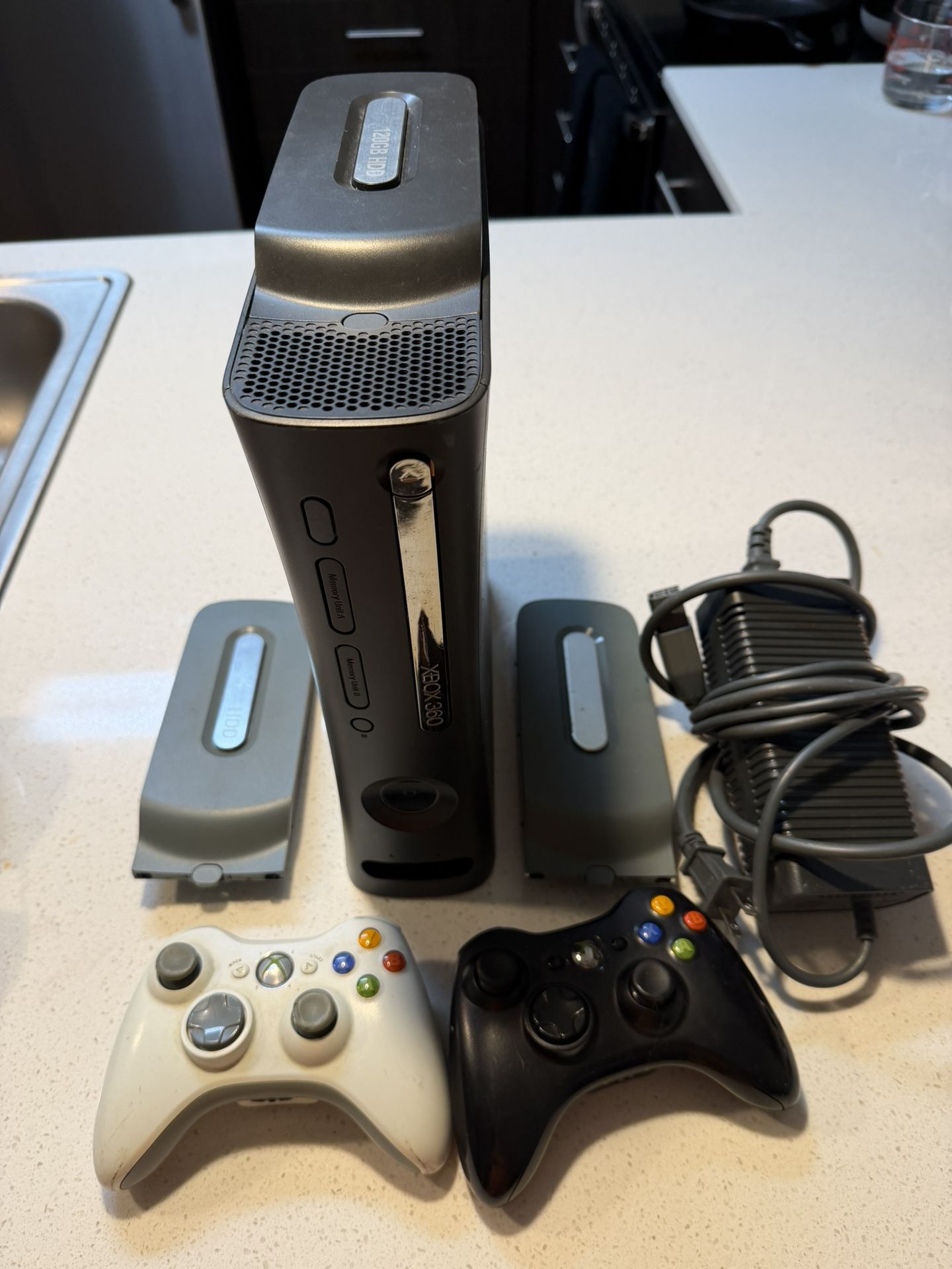 Works great, comes with three hard drives two controllers, power cord and HDMI cord just not included in picture.