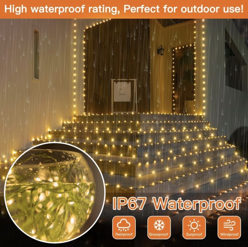 Features & details 【Extra Long Christmas String Lights】Outdoor Christmas String Lights are 328ft 1000 LED and 9.8ft/3m extension cord with high quality LED light beads and green rubber cord,these Christmas lights are enough for most of your indoor and outdoor scenes arrangements to create a warm festive atmosphere. 【8 Lighting Modes】Combination,in waves,sequential,slogs,chasing/flash,slow fade,twinkle/flash,and steady on. directly press the button on the transformer to switch the modes. 【Convenient Remote Control】Easily turn on/off the Christmas String Lights with the included remote control. You can also activate the timer mode (3 options: 3 hours/5 hours/8 hours) for automatic shutdown,adjust the brightness,or switch between 8 different lighting modes. Enjoy effortless control from the comfort of your sofa. 【Lightweight Design】A new generation design,bright and lightweight. The LED light string has an IP67 waterproof rating,and the light string can be submerged in water to emit light. Prevent dust from entering the lights beads,not only can be used indoors,but also can be used outdoors,even in rainy,snowy or stormy days. 【DIY Wide Range of Uses】Outdoor LED Christmas lights will not overheat for a long time,and you can safely touch the lights beads while working. The soft green rope can be easily made into the shape you want and wrapped around it,perfect for Christmas outdoor indoor patio,home,garden,lawn,patio,stairs,front door,Christmas tree,fence decoration.