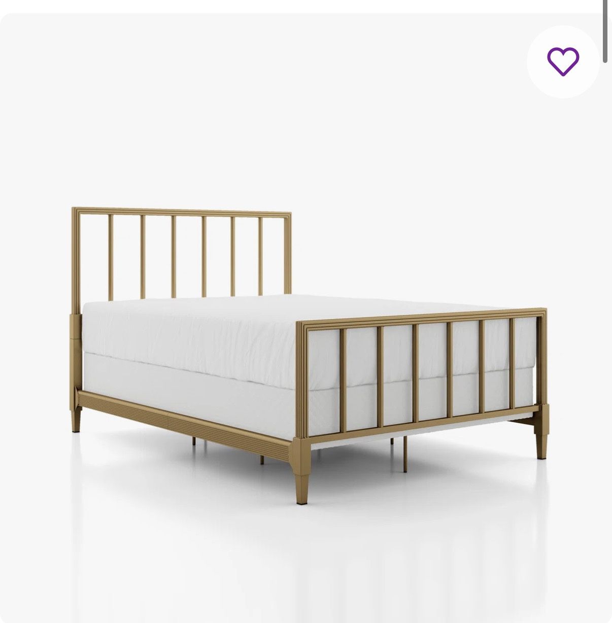 Vintage bed design in muted gold, assembles easily. Wipes clean with cloth. Currently priced at $331 on Wayfair.