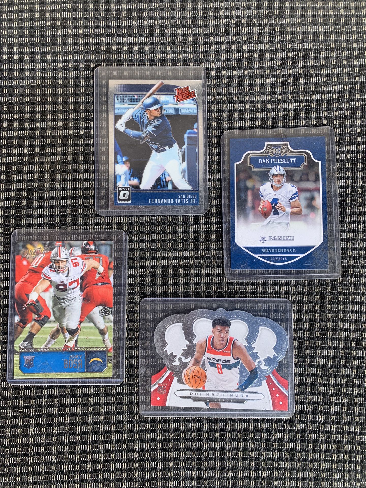 Cleaned closet found All these Rookies!! -Dak Prescott -Joey Bosa -RUI HACHIMURA -Fernando Attis jr. All rookies Asking $25.00 for all 4!!