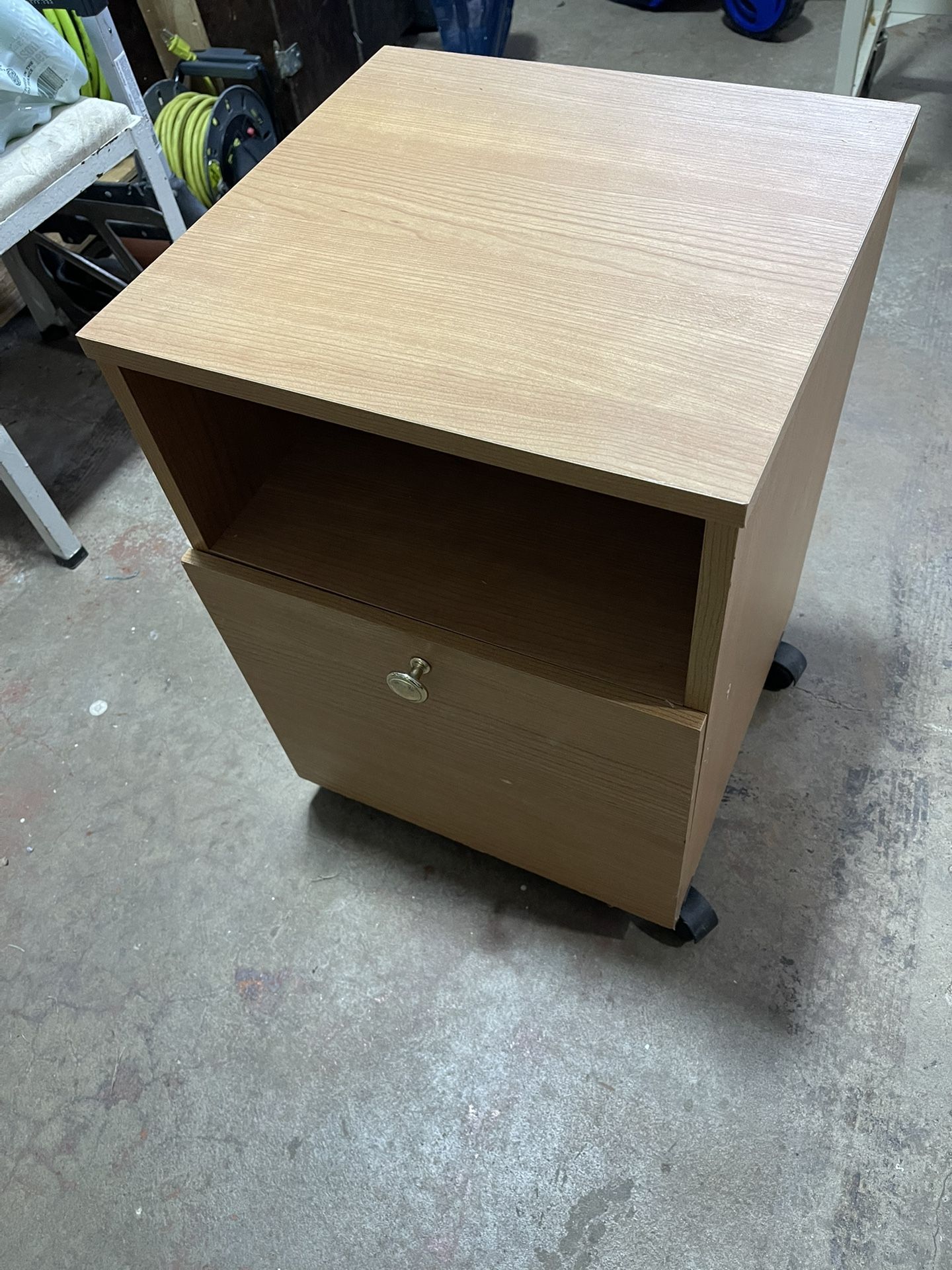 Wooden file cabinet with storage shelf on wheels. Dimensions: 15” deep x 15 1/2” wide x 22” tall