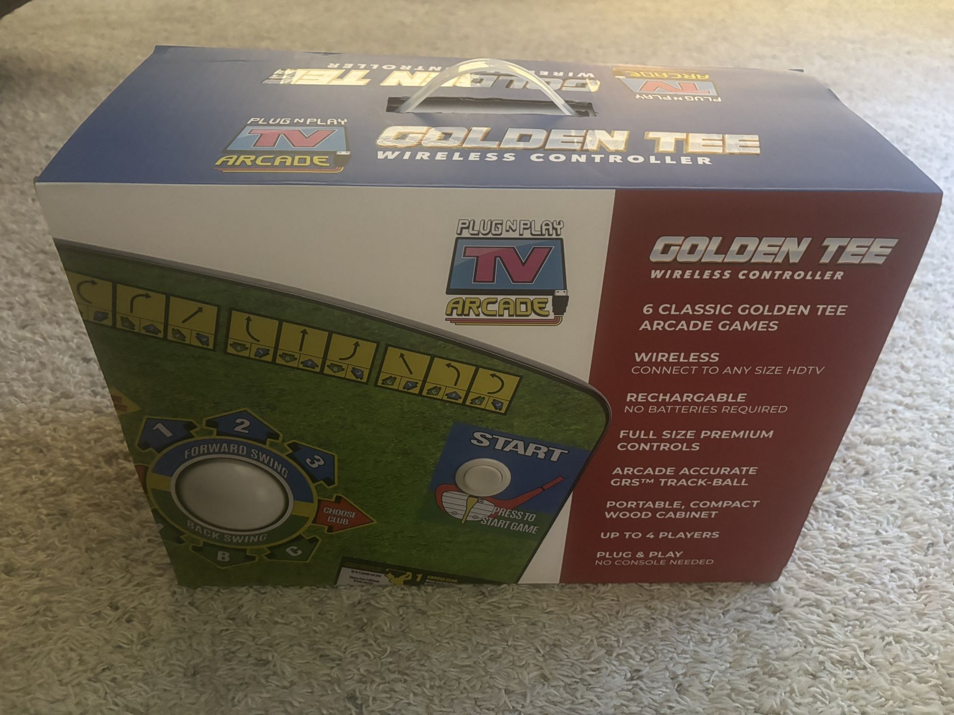 New Wave Toys golden tee wireless gamepad that hooks up wirelessly to your tv and plays 6 golden tee games with trackball on a control panel.