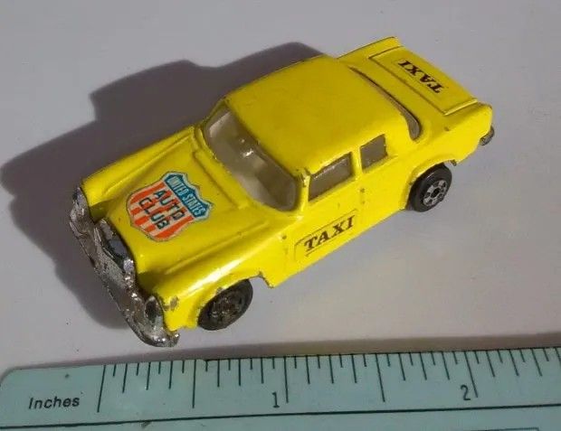 Late 70s Zylmex Mercedes 300-SE (D37) with the Taxi stickers on the sides and trunk. Has the united States Auto Club shield sticker on the hood. Has play wear.
