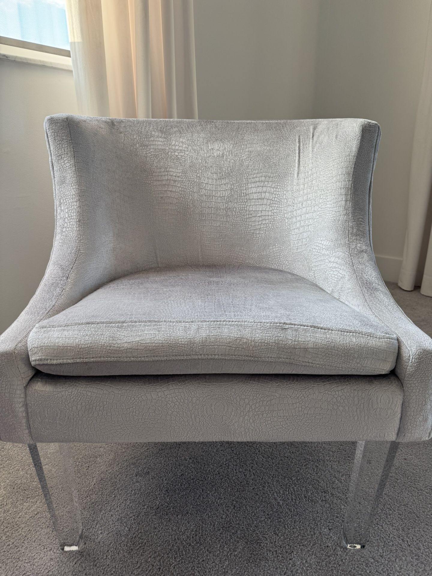 PICK UP ONLY Chair was in a Pet & Smoke free home. The classy yet stylish look of the Deidre silver accent chair is tapered to perfection. The sumptuous soft silver croc patterned velvet upholstery and tall lucite legs provide subtle elegance that will enhance the style of any space. Color Gray Primary Material Plush Collection Deidre Fabric & Care Easy Clean! Dimensions Overall (in.) 32.1"w"w x 27.15"d"d x 30.3"h"h