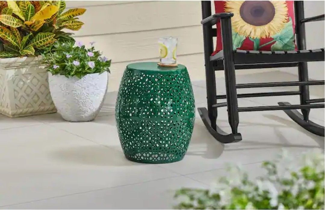 Hampton Bay 17"H Metal Cut Out Garden Stool. Retail $59.98, $20 Firm 1 small ding on the upper edge. See last picture.