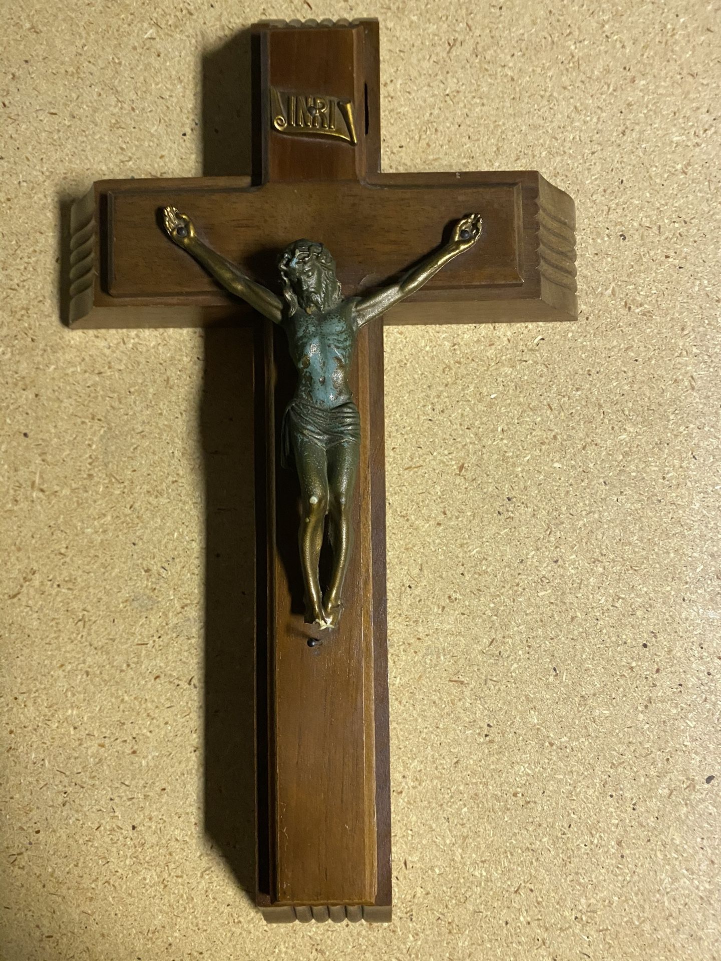 This cross is very old. It slides open and has two candles that can be put in the base of the cross if you need them. The body has a little copper discoloration and the feet have broken off. Otherwise, the cross itself is in perfect condition.