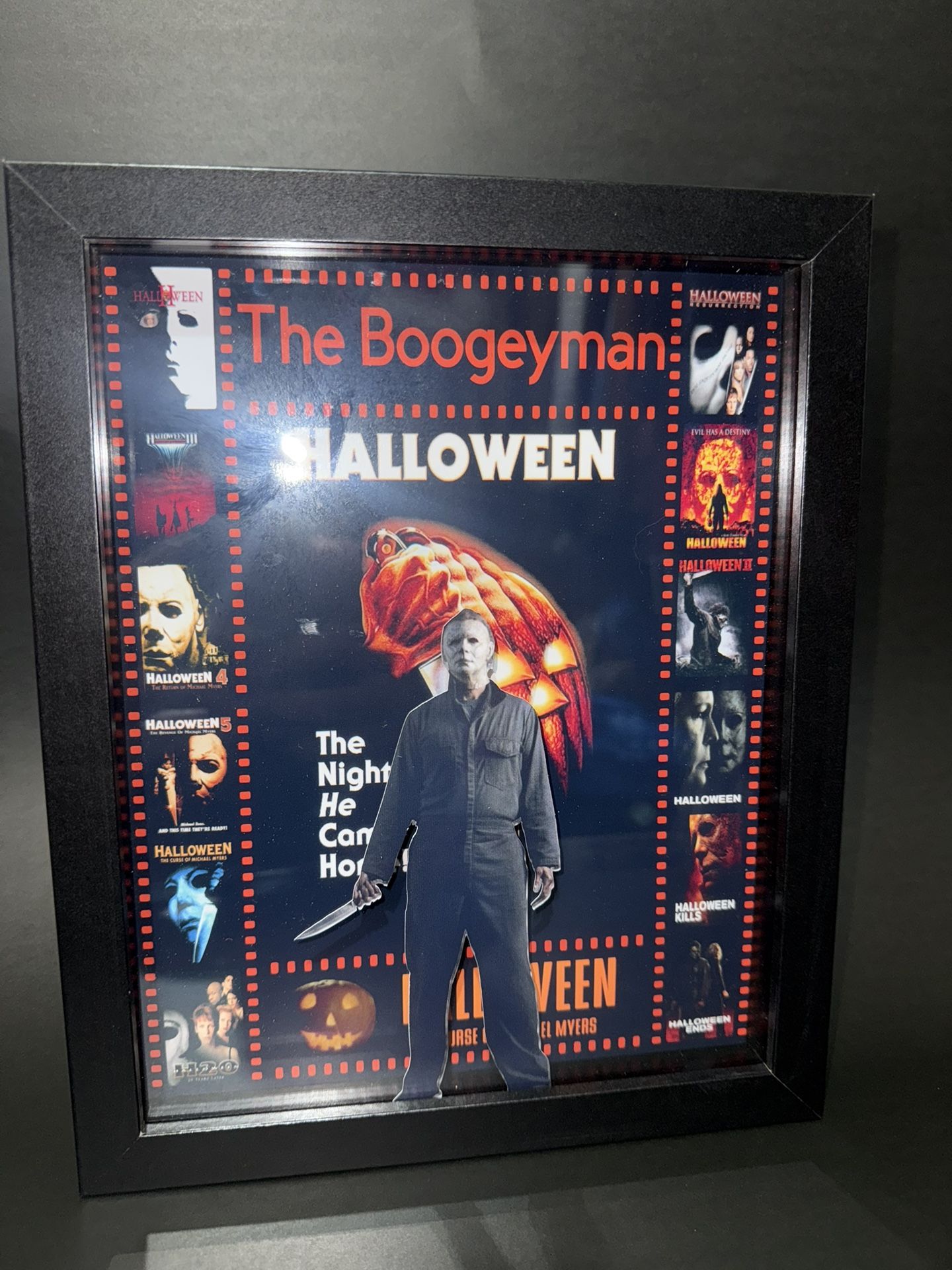 Micheal Myers the boogeyman movie poster images clip art. This very unique piece has all the movie poster images as well as Micheal Myers in front of frame poping out from the image in the background. This piece is perfect for convention autograph signing. Get all of the actors autograph in one print. This piece is 8x10. If ur interested in a 11x14 print feel free to message me. The price on the 11x14 is $60