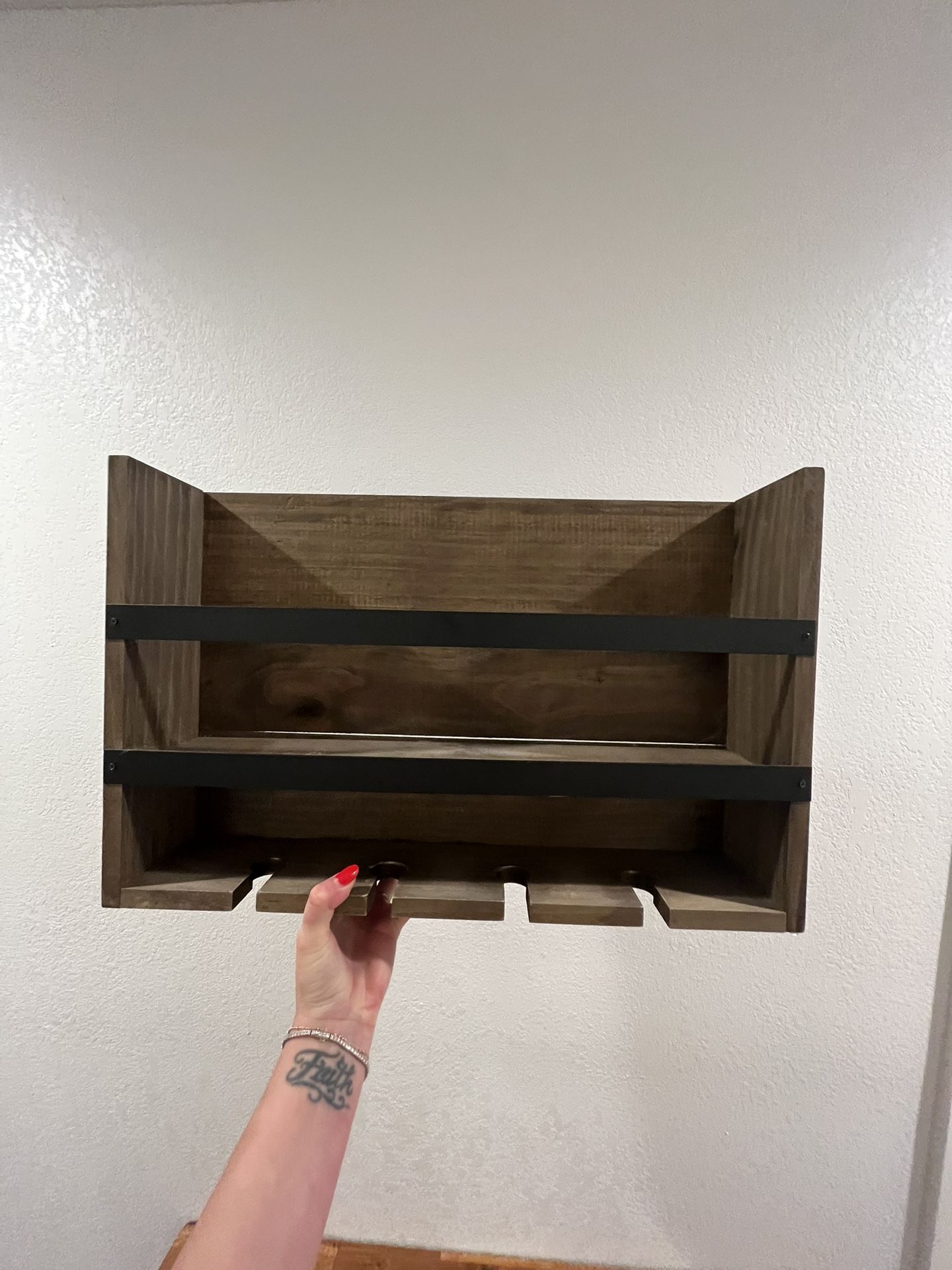 Wine rack holds up to 5 bottles and and 4 wine glasses. Brackets on the back allow for easy hanging.