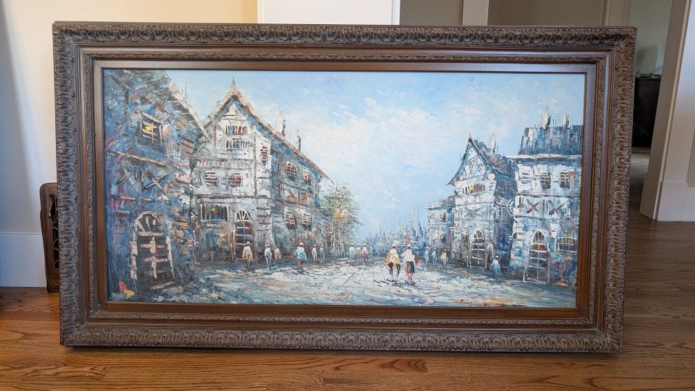 32 1/4" x 56" Vintage European village scene painting with a decorative wood frame. Excellent Condition.