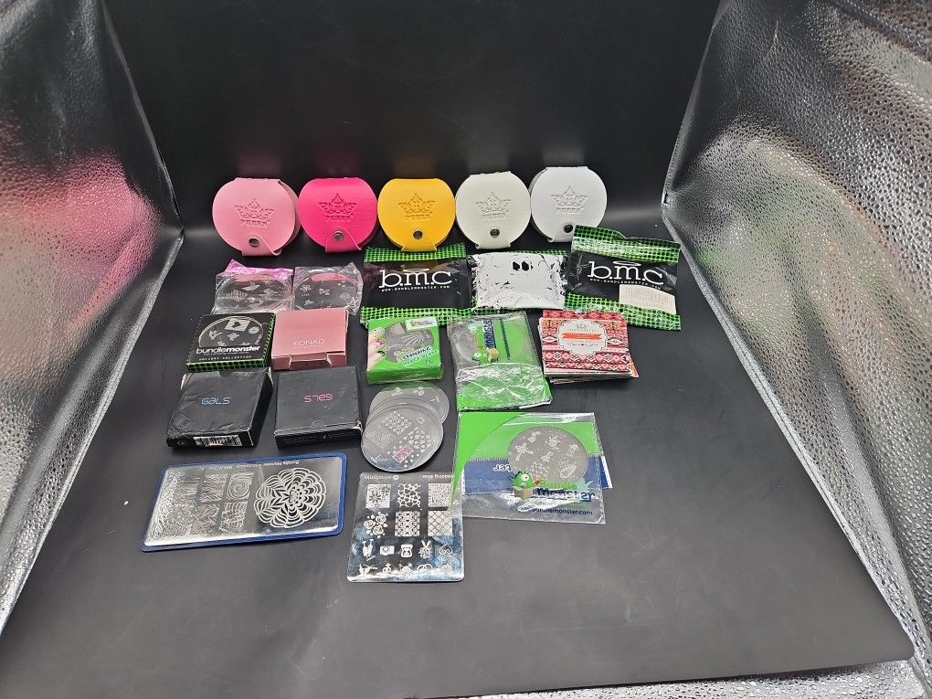 Some new and used metal nail stamps. Too many to list! Each of the color cases has 10 to 12 in them. The full lot is approximately 100 stamps.