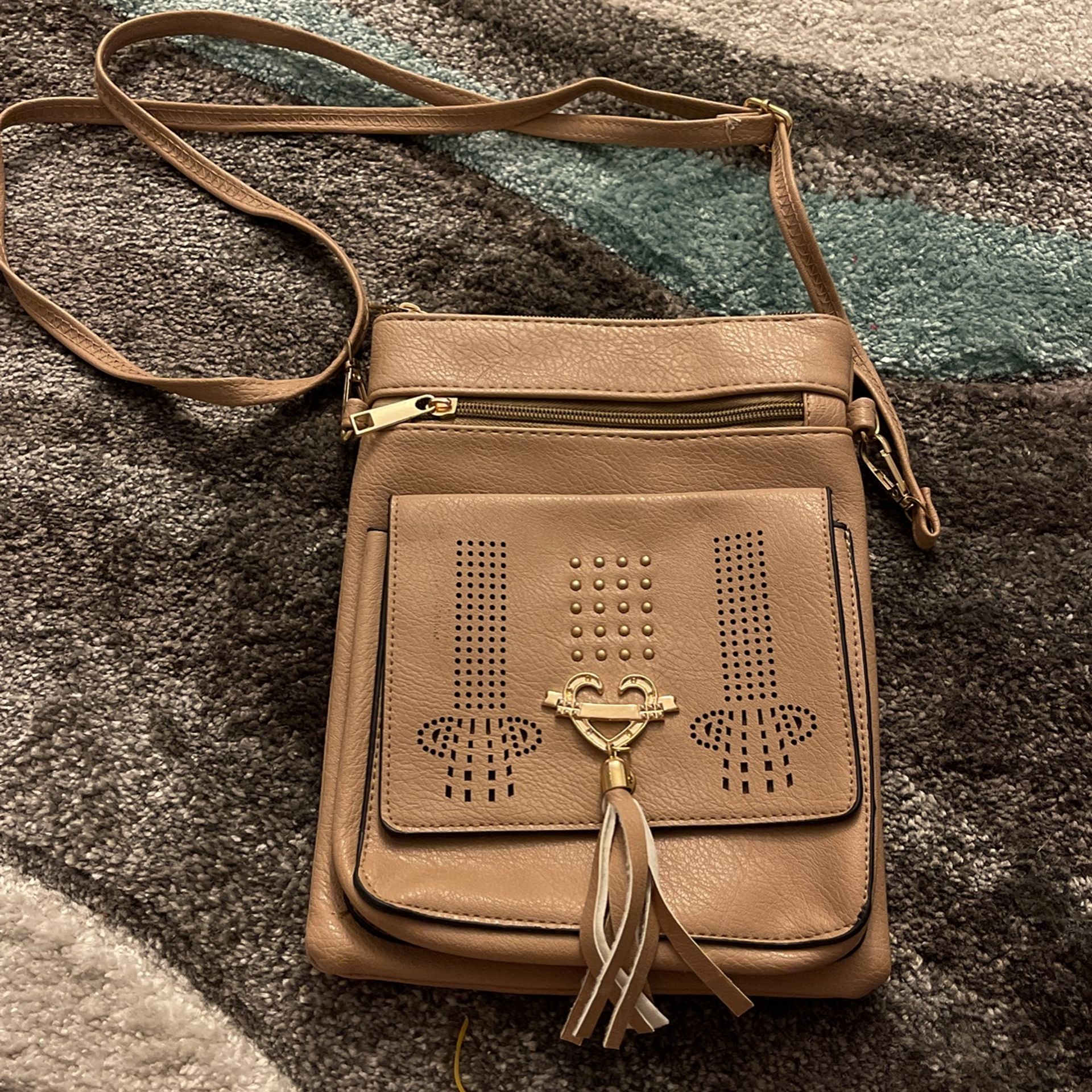 Tan over the shoulder hand bag with adjustable strap. Has front pocket with button and three zipper pockets. Never used
