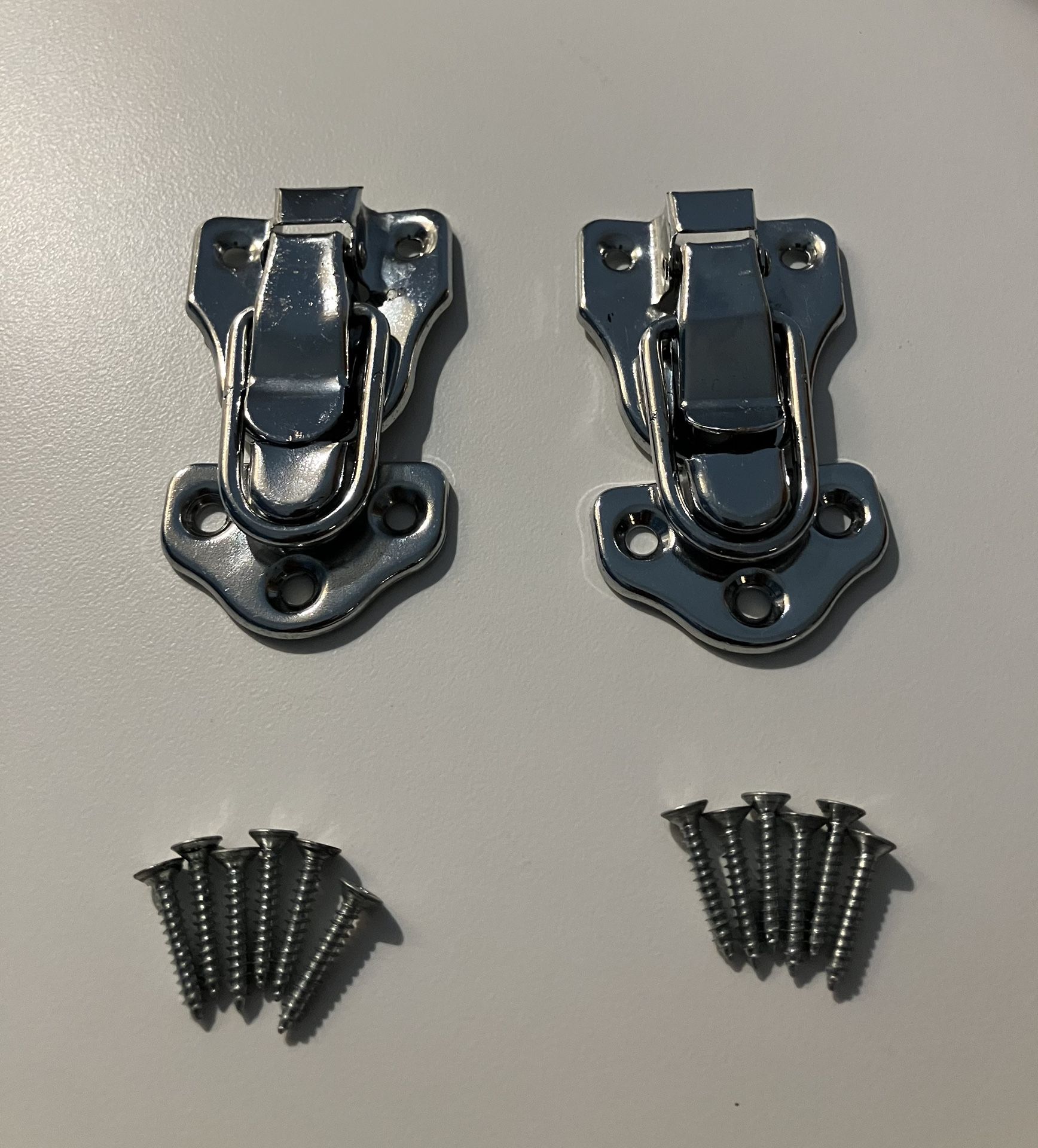 Set of two silver used metal latches with screws. Perfect for securing cases.