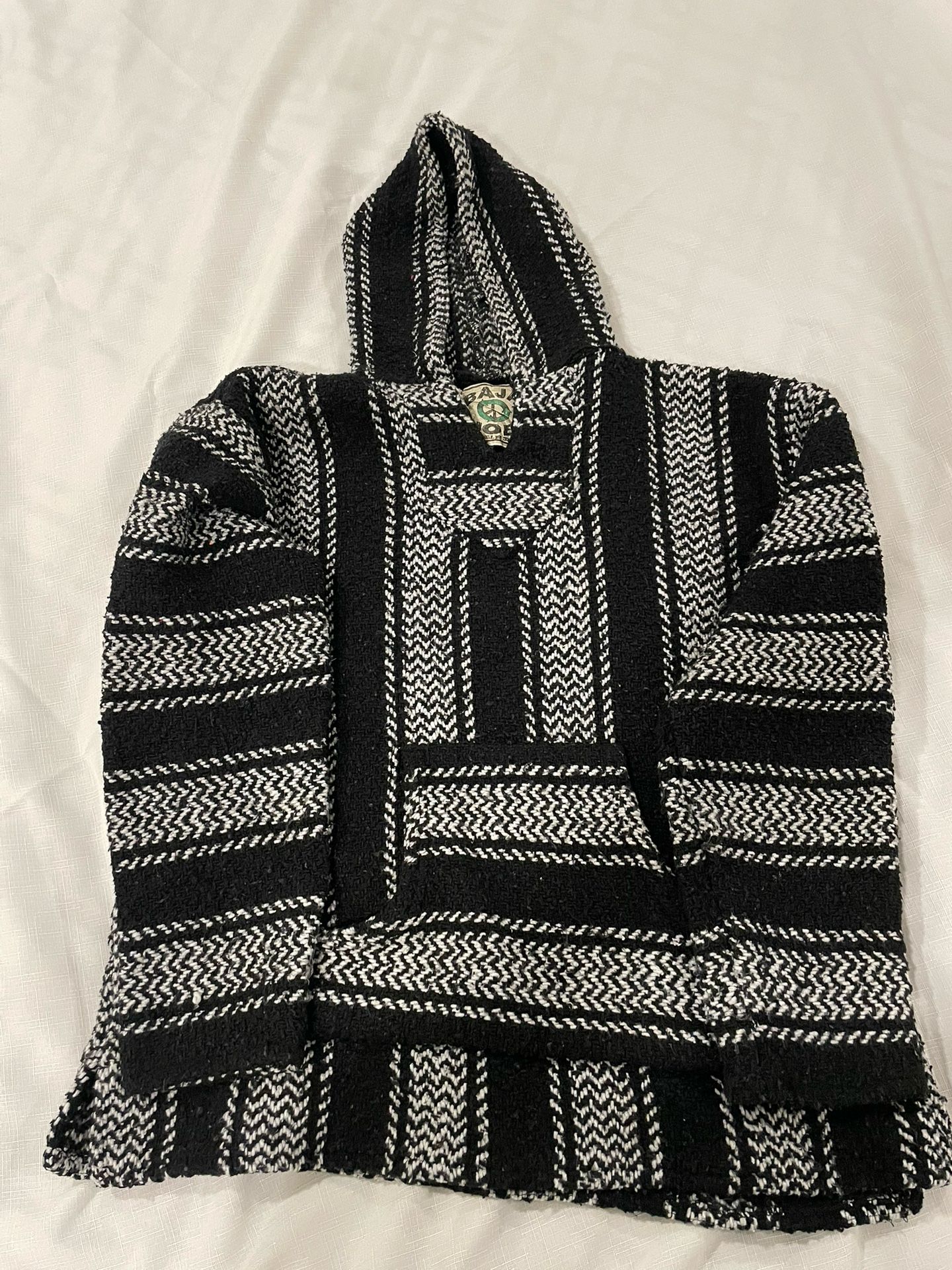Embrace the classic charm of this black and white striped sweatshirt, featuring a bold geometric design. The woven texture adds a touch of traditional style, making it perfect for casual outings or cozy days at home.