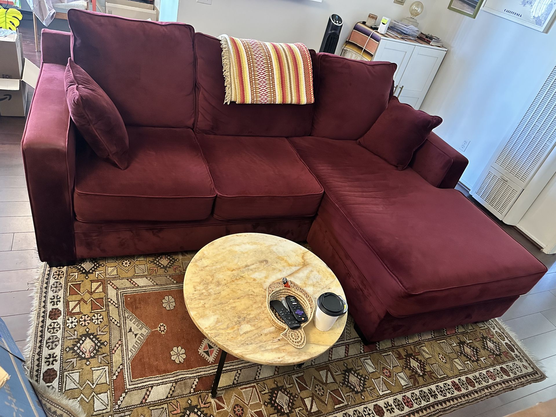 Beautiful, custom 3-cushion couch in vibrant wine color. Owner lived single and is a non-smoker, no pets. Dimensions: 88.5" long 30" deep 66" deep (chaise side) Pick up only