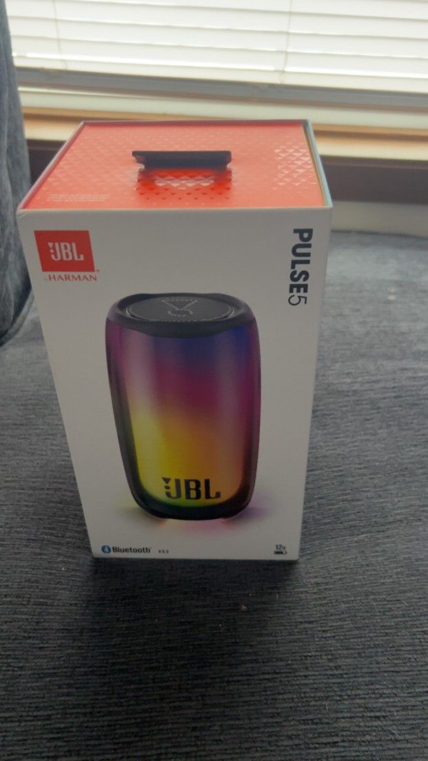 The JBL Pulse 5 is a portable Bluetooth speaker with a 30W output, 12-hour battery life, and IP67 dustproof and waterproof rating. Key features include a 360-degree light show that syncs with your music, JBL Original Pro Sound, Bluetooth 5.3 connectivity, and the ability to pair with other PartyBoost-enabled speakers. It charges via USB-C and includes a woofer and a tweeter for bold sound. Selling for $150 or best offer.