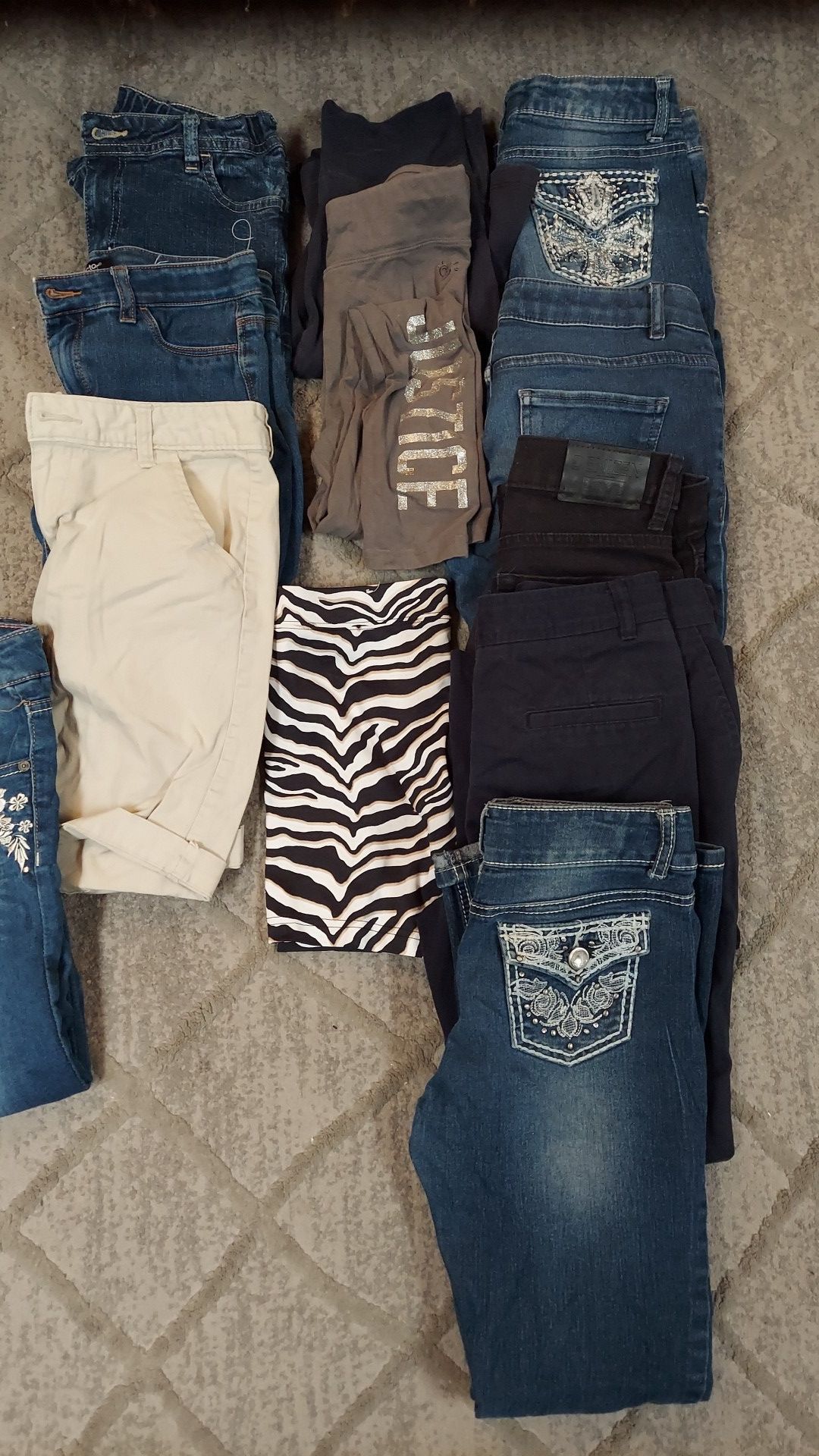 Girls size 12 Two long skirts, one short skirt, one capri, three shorts, one spandex, two leggings, five pants(4 jeans)
