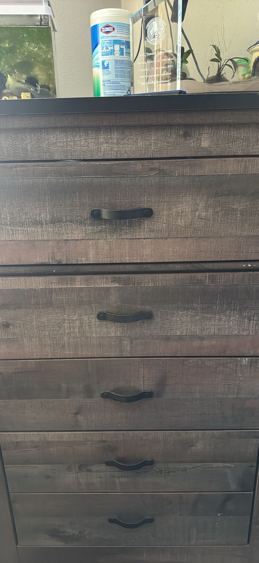 Brown. Pet friendly home—cats and dogs. Drawers open smoothly. Make an offer