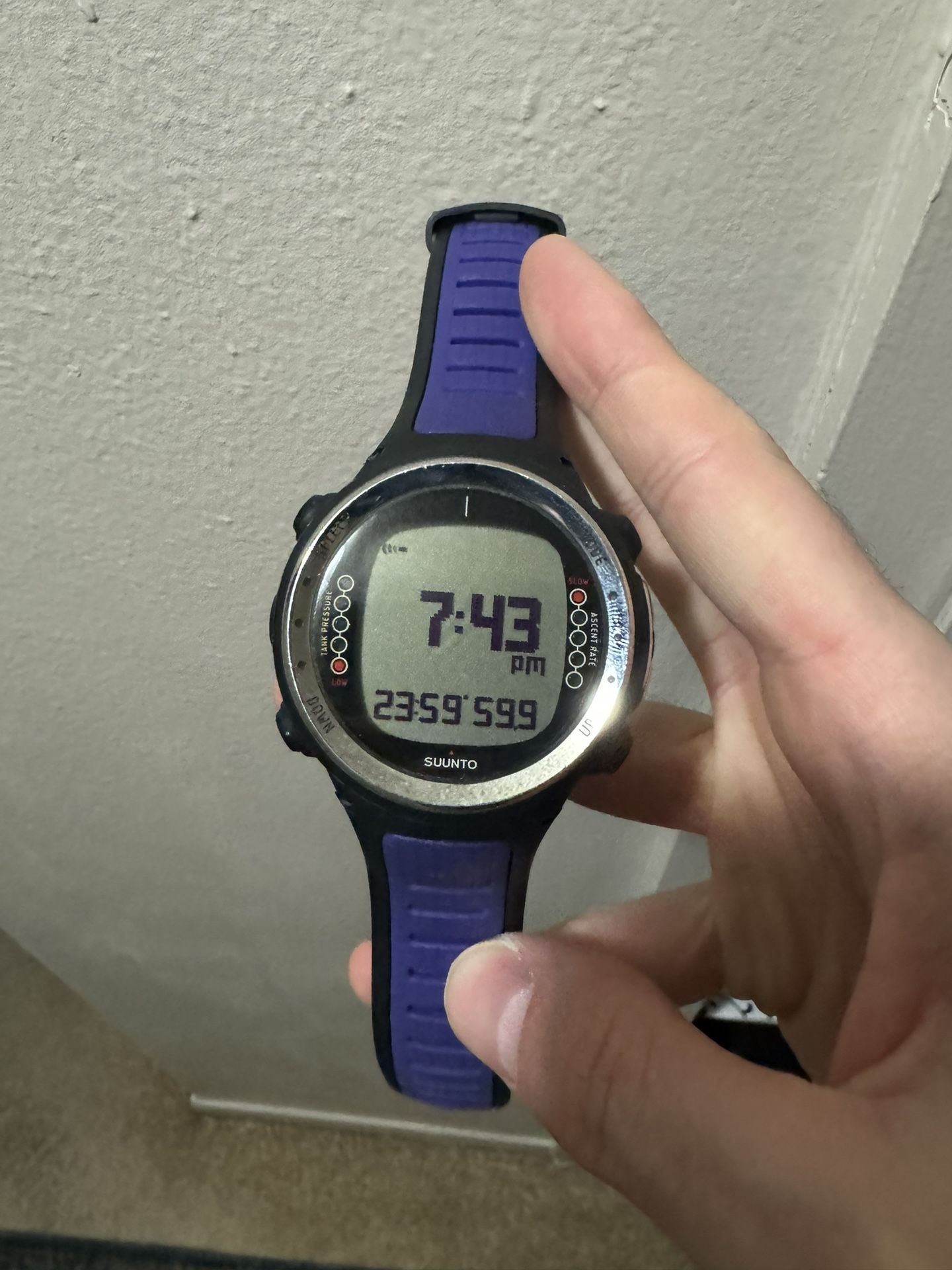 Used. Great condition aside from typical scratches on metal underside. Batteries for both the watch and transmitter were just replaced and serviced at Hollywood Divers, so they’re good as new. Well taken care of.