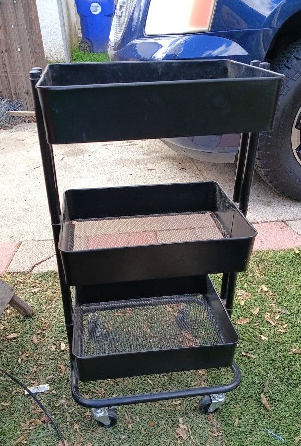 This product is a black 3-tier metal rolling utility cart used for storage organization. Features: Includes four rolling wheels for mobility. Design: Features three mesh baskets for ventilation and storage. Material: Constructed from metal tubes and mesh wire. Usage: Versatile for use in kitchens, bathrooms, or offices. Asking $15.00 also open to offer's.