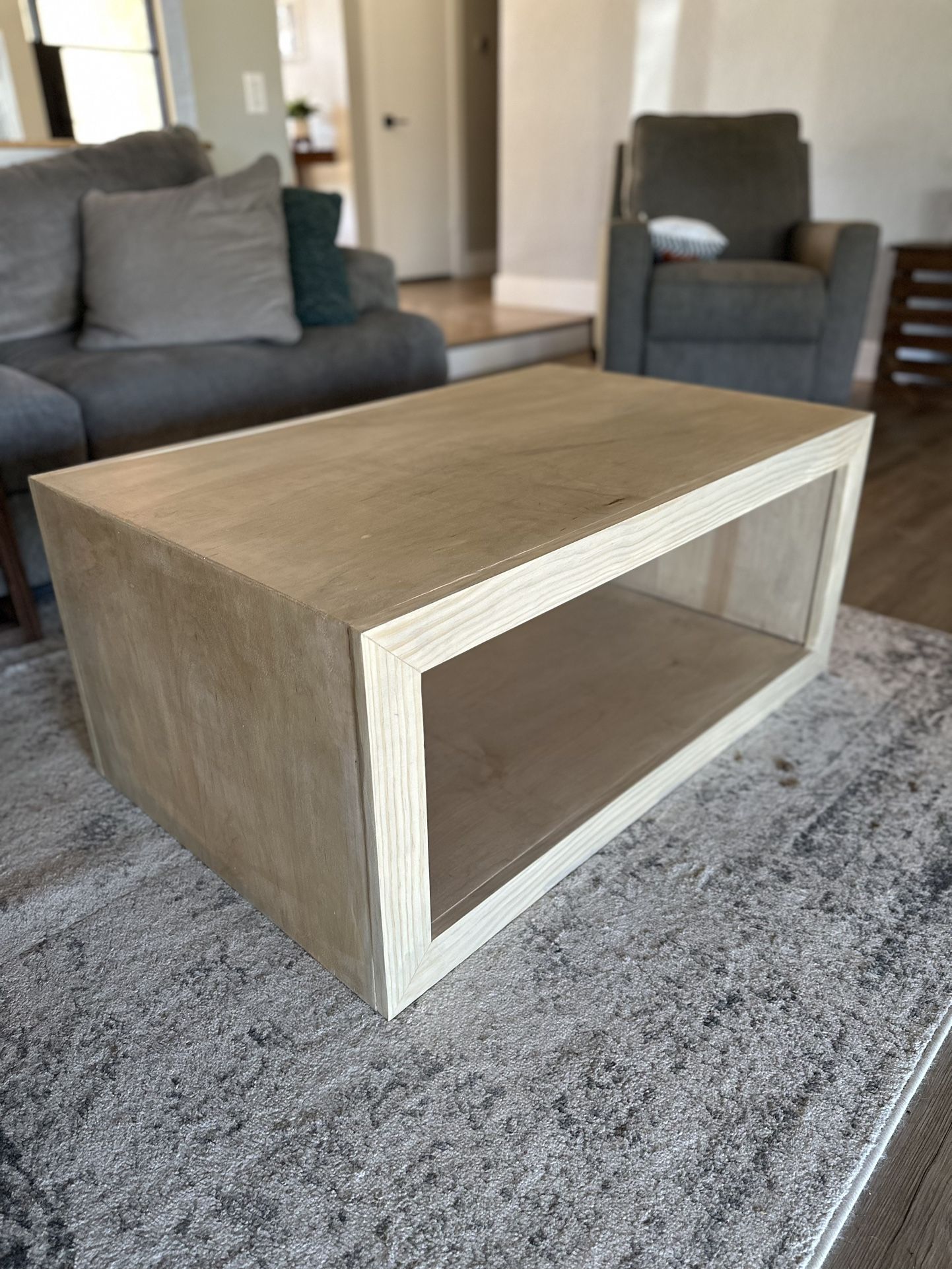 This coffee table is handmade, constructed out out maple hardwood. It measures 40” L x 24” W x 18”H. Stained in weathered oak and sealed with polyurethane. Price listed is for this specific table only. Custom orders are available for size/stain, pm me. Delivery available, additional cost depending on location.
