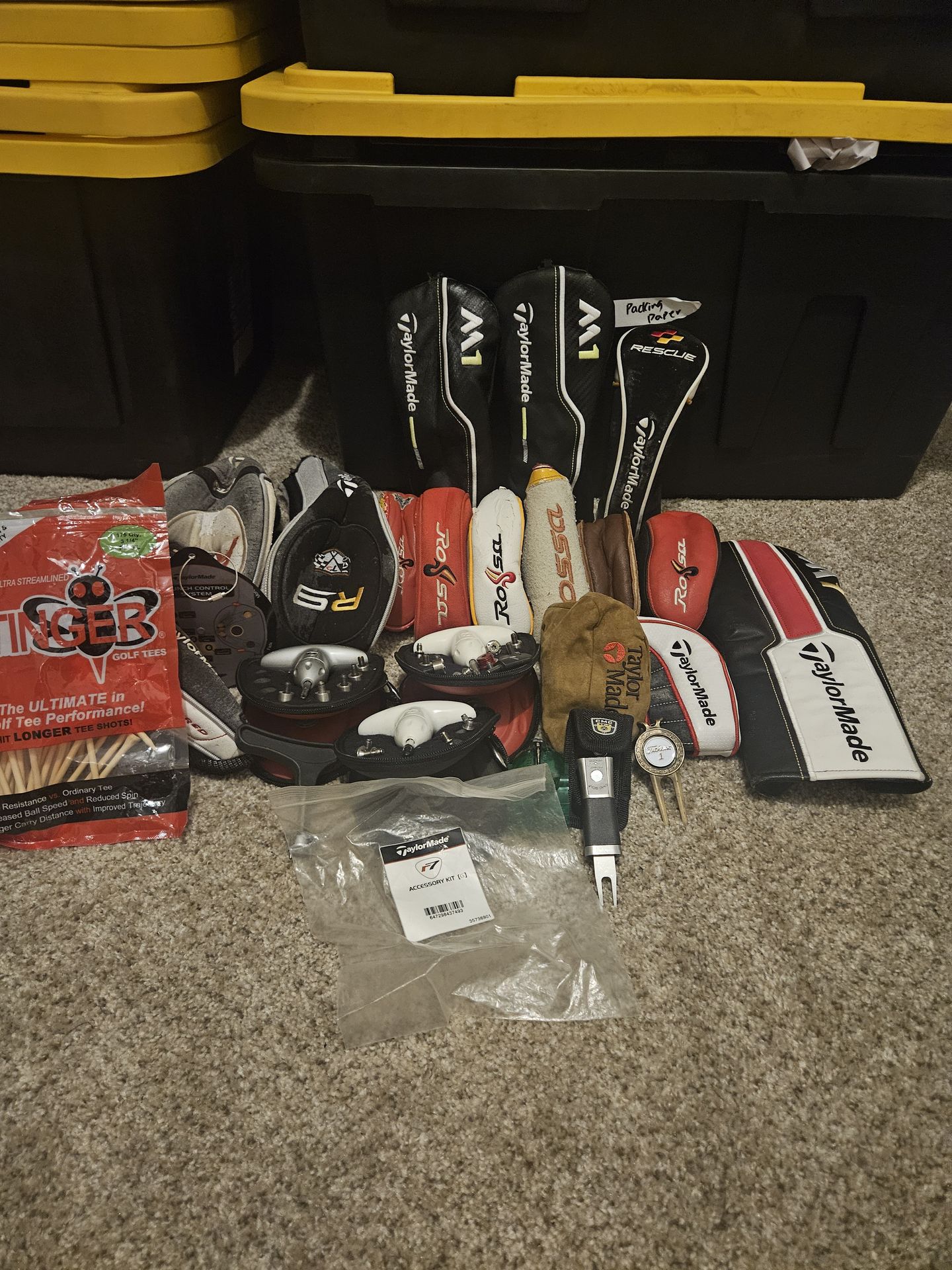 I have TaylorMade Rosa putter cupboard M1 driver covers R9 driver covers there's a golf divots there's all the complete sets of weight for the adjustable drivers TaylorMade all for $ $25