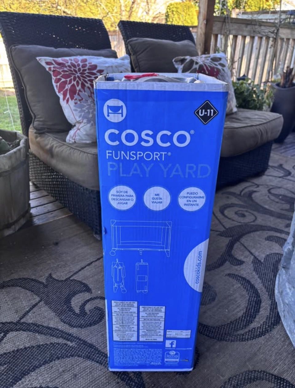 New Cosco Funsport Play Yard. Still in box, gently used. Perfect for little ones to play or rest. Sets up quick, good for travel.