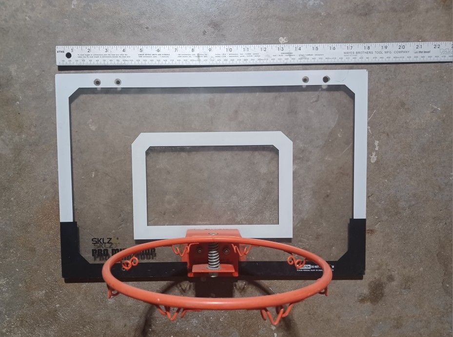 No net, no ball Goes over the door, but missing door hooks 18 in. Length x 12 in. Height 9 in. Rim