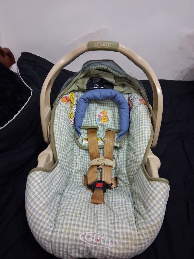 Graco infant car seat Winnie the pooh and piglet Has no base but has the slots to secure the car's seatbelt/lap belt.