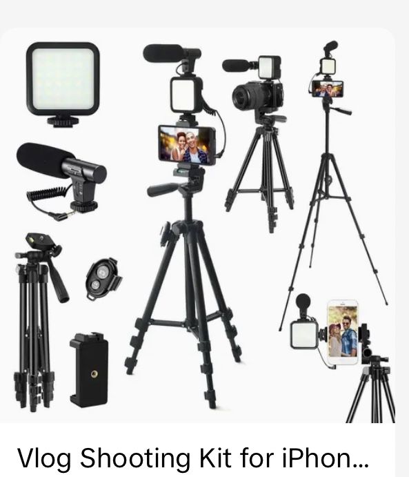 Tripod with phone holder, light and microphone