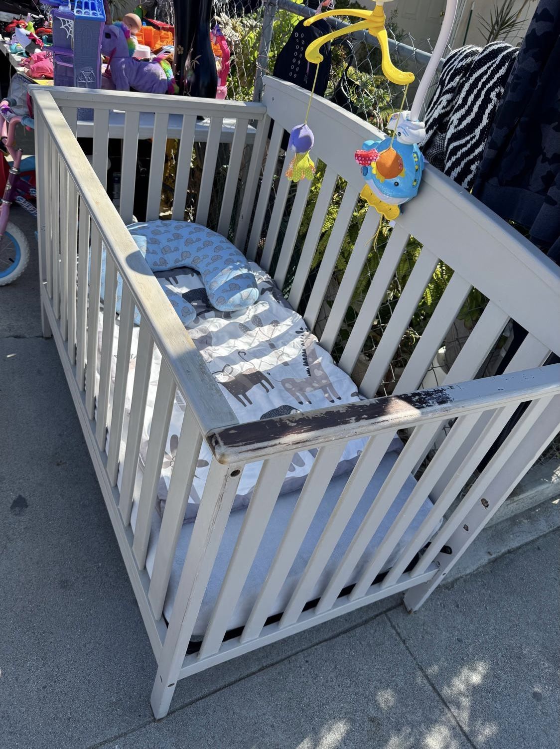 $35 with everything included (mattress with cover, small blanket and pillow) It does have peeling from the paint on one side as it is shown in the picture.