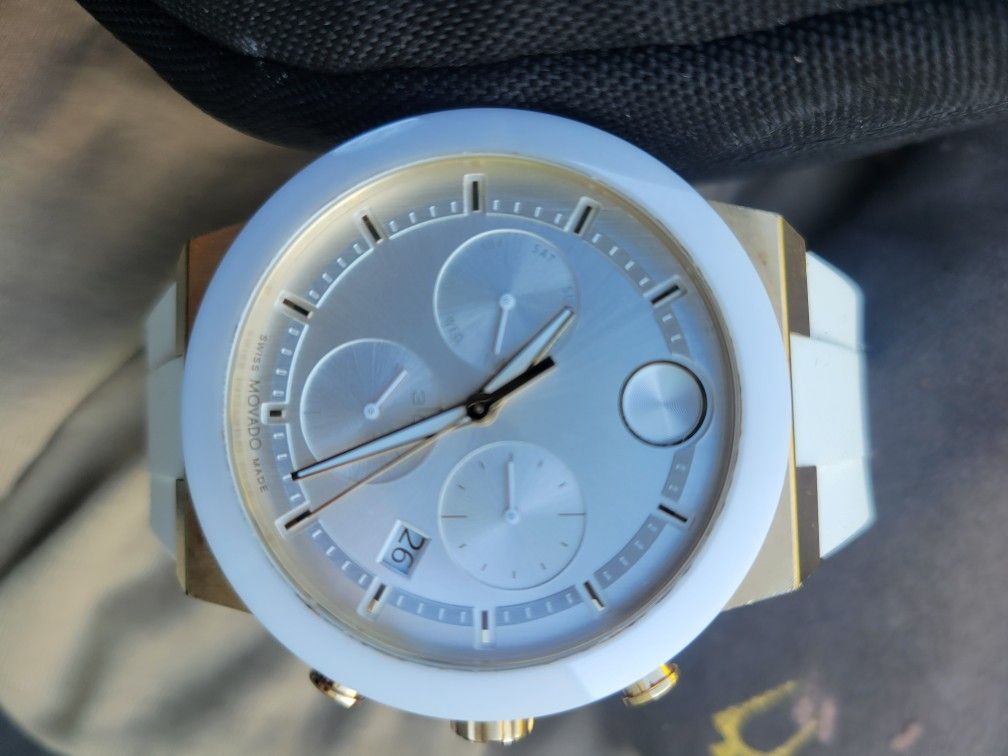 This timepiece is built with high-quality materials designed for both durability and style. Movement: Powered by a precise Swiss quartz movement. Case: A 44mm case crafted from pale yellow gold ion-plated stainless steel. Bezel: Features a sleek white ceramic bezel. Crystal: Protected by a K1 mineral crystal, which is more shatter-resistant than traditional sapphire and more scratch-resistant than standard mineral. Water Resistance: Rated for 5 ATM (50 meters), making it suitable for light swimming but not diving.
