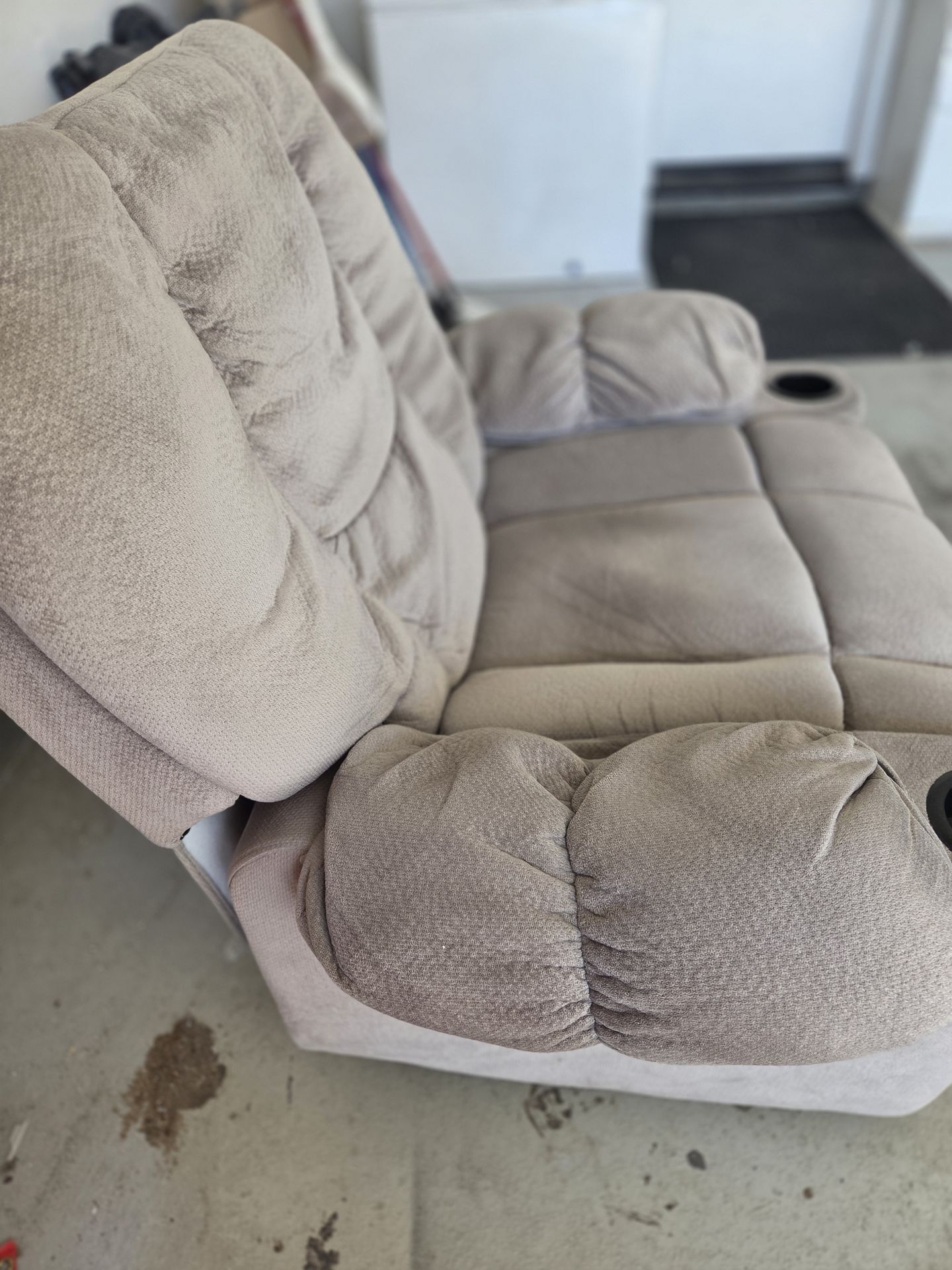 Very plush and comfortable. It rocks and reclines.has cup holders. Heavy duty upholstered material. No stains, rips, or wear marks Size L44" x W39" x H39"